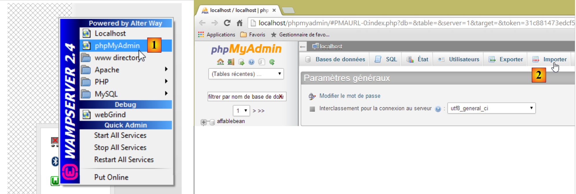 - en [1], on sélectionne l'outil [phpMyAdmin] de WampServer ;