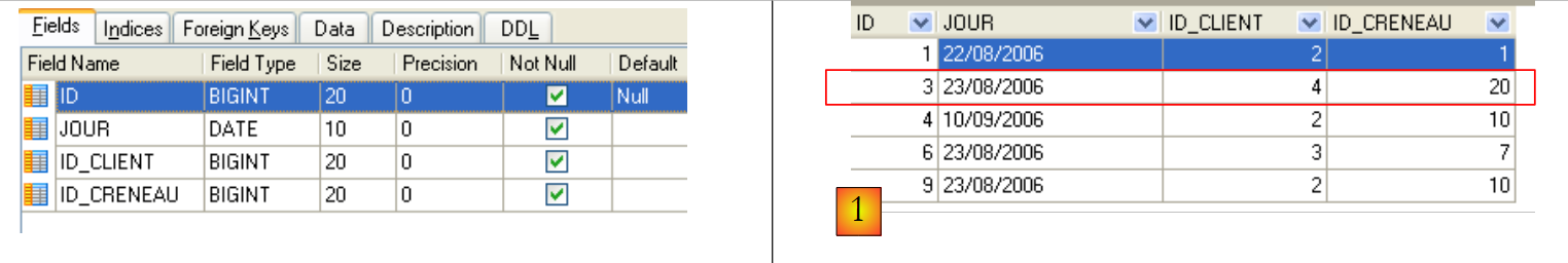 Cette table a une contrainte d'unicité sur les valeurs des colonnes jointes (JOUR, ID_CRENEAU) :