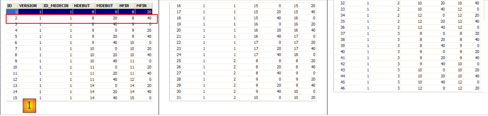 La seconde ligne de la table [CRENEAUX] (cf [1] ci-dessus) indique, par exemple, que le créneau n° 2 commence à 8 h 20 et se termine à 8 h 40 et appartient au médecin n° 1 (Mme Marie PELISSIER).