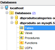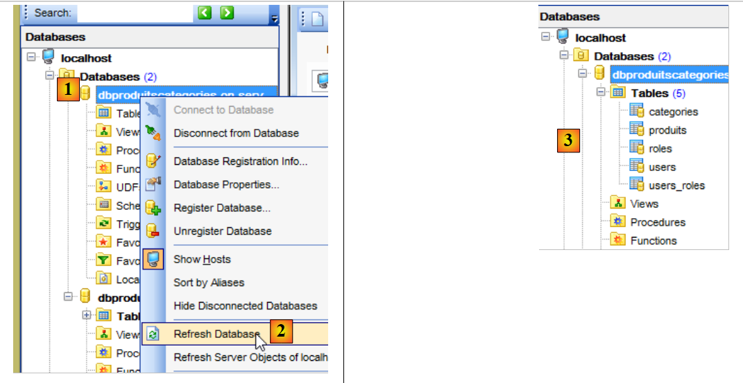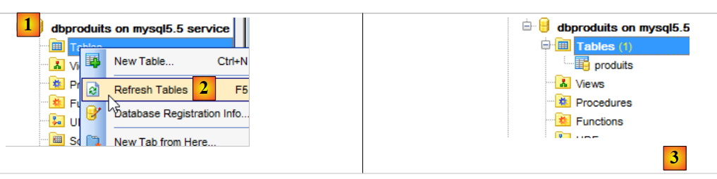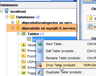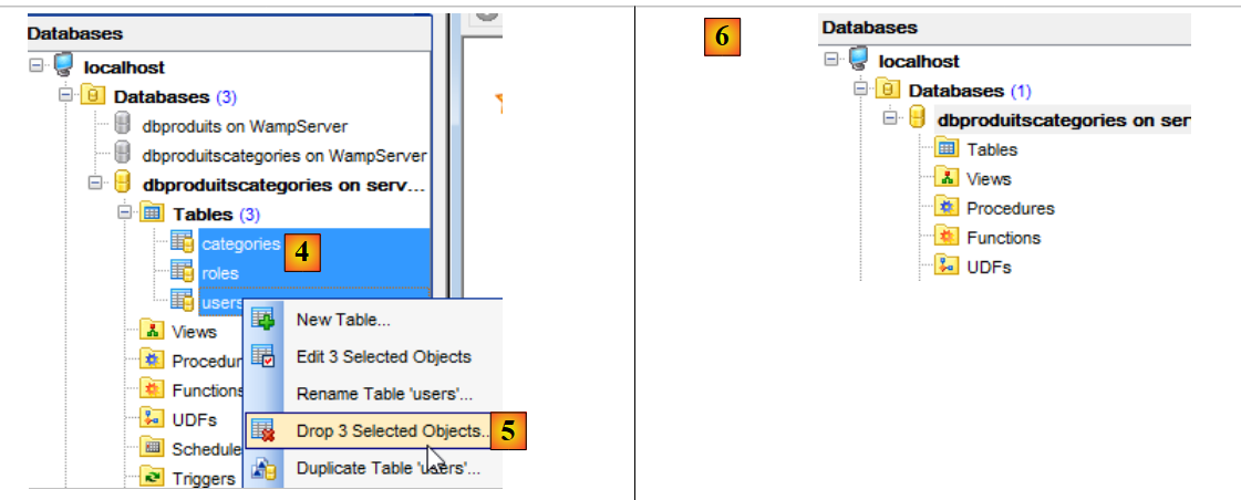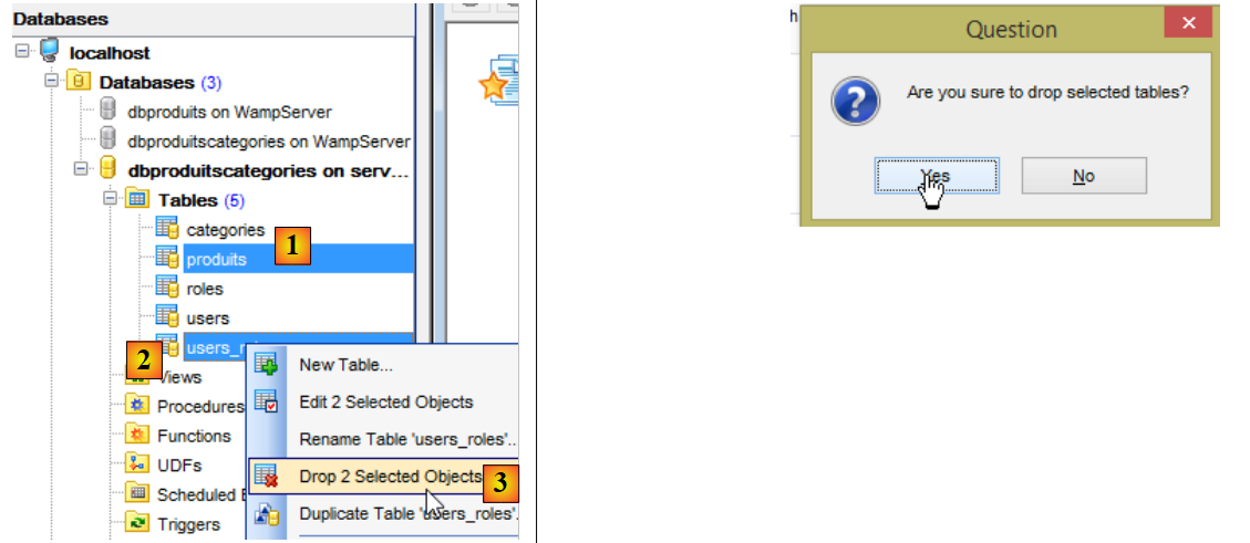 Puis nous supprimons les tables de la base MySQL [dbproduitscategories] avec le client [MyManager] (cf paragraphe 23.5). Nous commençons par supprimer les tables qui contiennent les clés étrangères [1-3] :