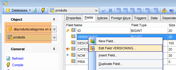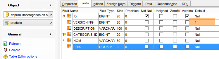 La table [PRODUITS] est créée avec la configuration d'exécution suivante :
