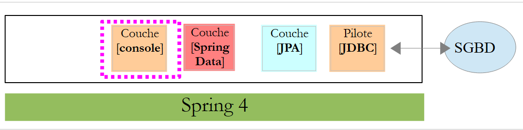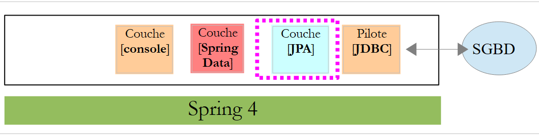 On intercale une couche [JPA] (Java Persistence API) entre la couche [DAO] et le pilote JDBC du SGBD. C'est désormais la couche JPA qui émet les ordres SQL destinés au SGBD. La couche [DAO] ne manipule plus d'ordres SQL mais seulement des objets appelés entités JPA qui sont des images des différentes tables de la base de données exploitée. Les champs de ces entités sont associés de façon unique à des colonnes de tables grâce à des annotations Java. C'est ce qui permet à la couche JPA de traduire en SQL les opérations de la couche [DAO] faites sur les entités JPA.