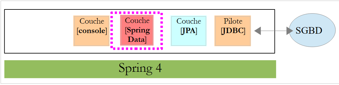 Spring Data est une branche de Spring qui s'intéresse à l'accès aux données, que celles-ci soient logées dans une base de données relationnelles SGBDR, une base NOSQL, ou d'autres types de dépôt. Nous ne nous intéressons ici qu'aux SGBDR et à leur accès via JPA. Par la suite il nous arrivera d'écrire [Spring JPA] pour désigner en fait [Spring Data JPA]. Dans l'architecture ci-dessus, la couche [Spring Data] amène des facilités à la couche [DAO] pour gérer les entités JPA.