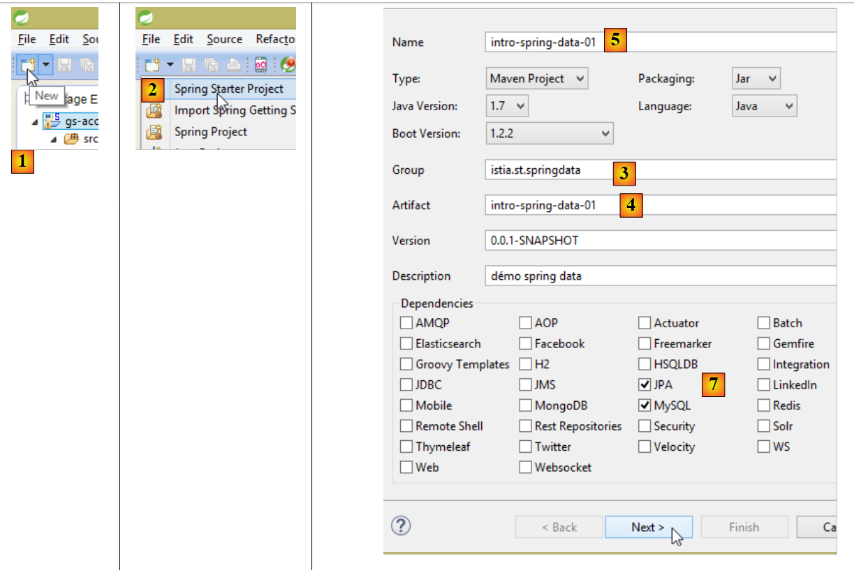 - en [7] : on indique qu'on va créer un projet ayant une couche [JPA] avec le SGBD MySQL. Les dépendances nécessaires à un tel projet vont alors être incluses dans le fichier [pom.xml] ;
