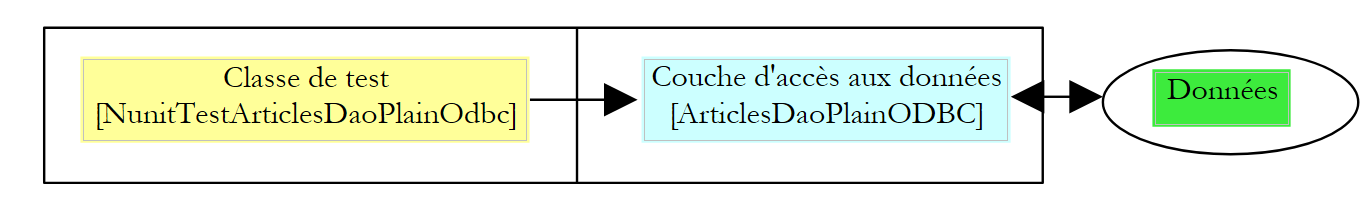 Notre classe [ArticlesDaoPlainODBC] obtient ces informations via l'agent extérieur qui instancie un membre de la classe. On peut se demander comment celui-ci obtient les trois informations nécessaires à l'instanciation de la classe [ArticlesDaoPlainODBC]. Prenons un exemple. Supposons qu'on veuille écrire une classe de test de la couche [Dao]. On aurait l'architecture suivante :