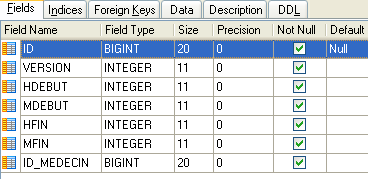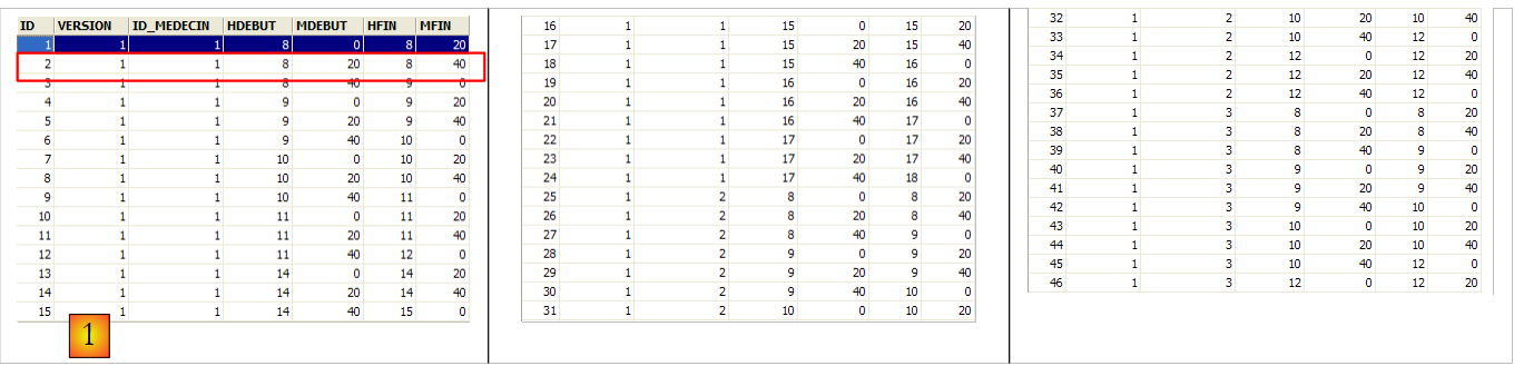 La seconde ligne de la table [CRENEAUX] (cf [1] ci-dessus) indique, par exemple, que le créneau n° 2 commence à 8 h 20 et se termine à 8 h 40 et appartient au médecin n° 1 (Mme Marie PELISSIER).