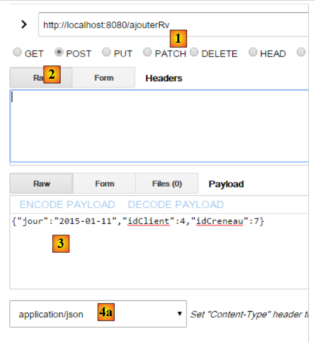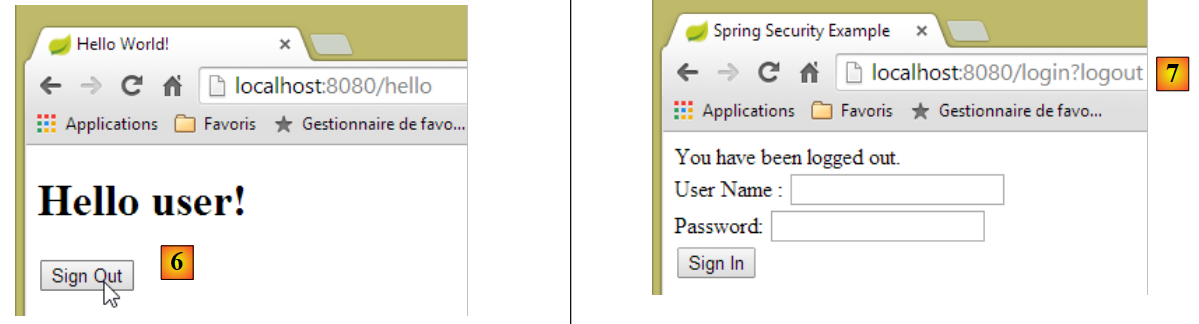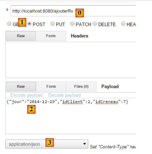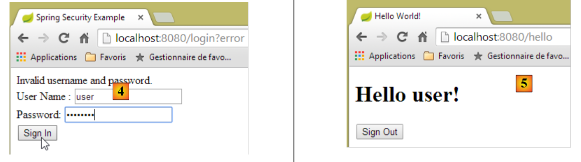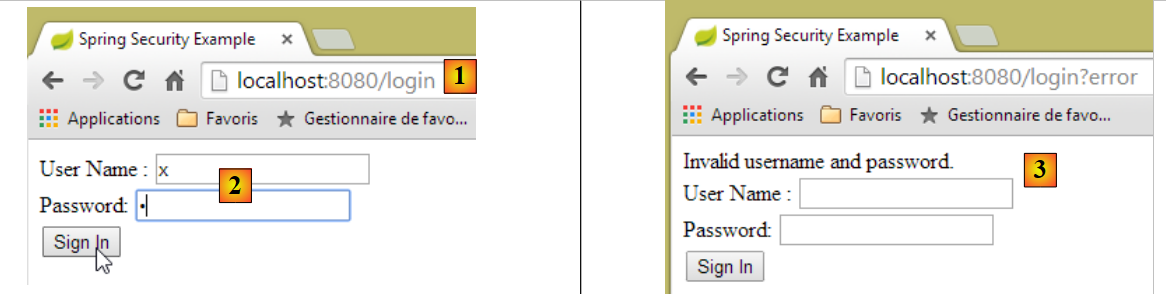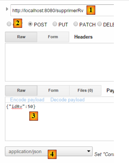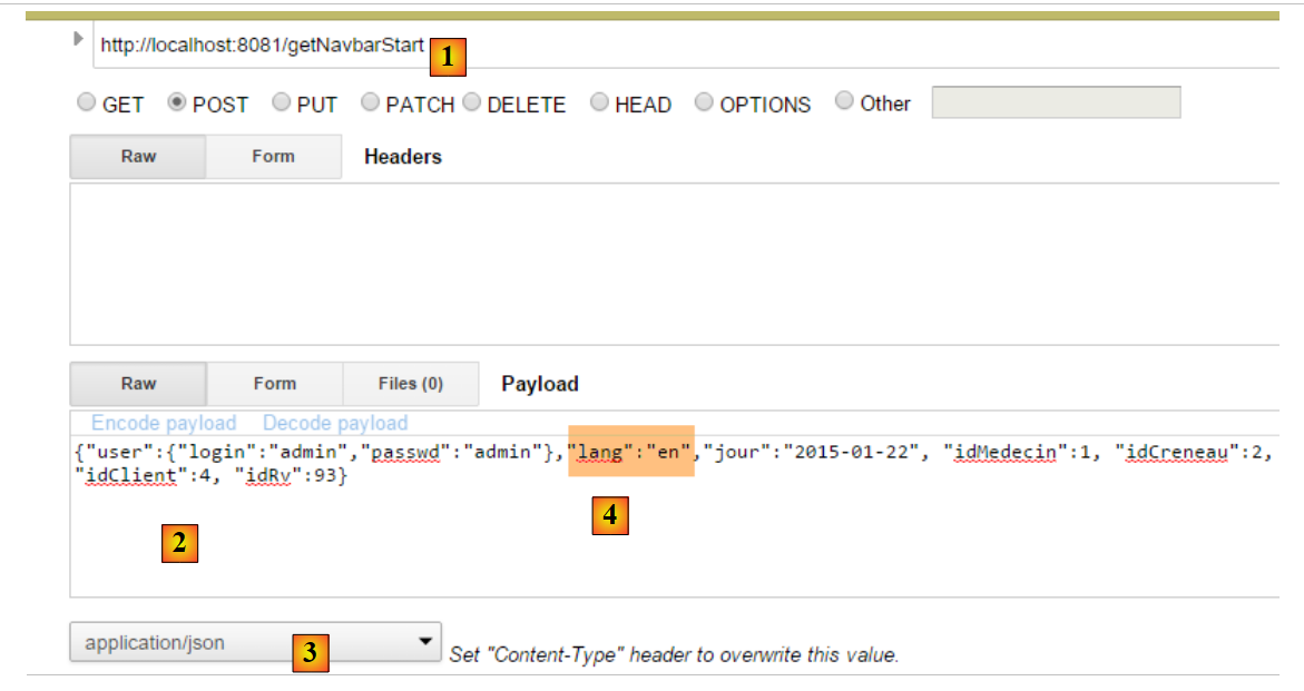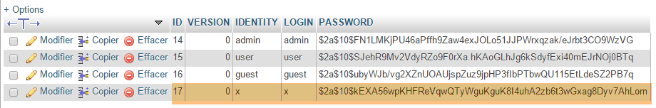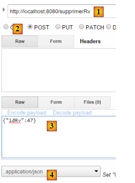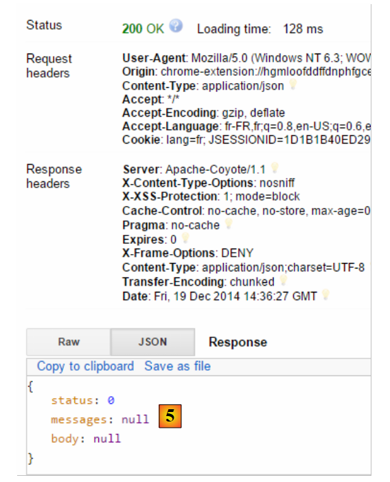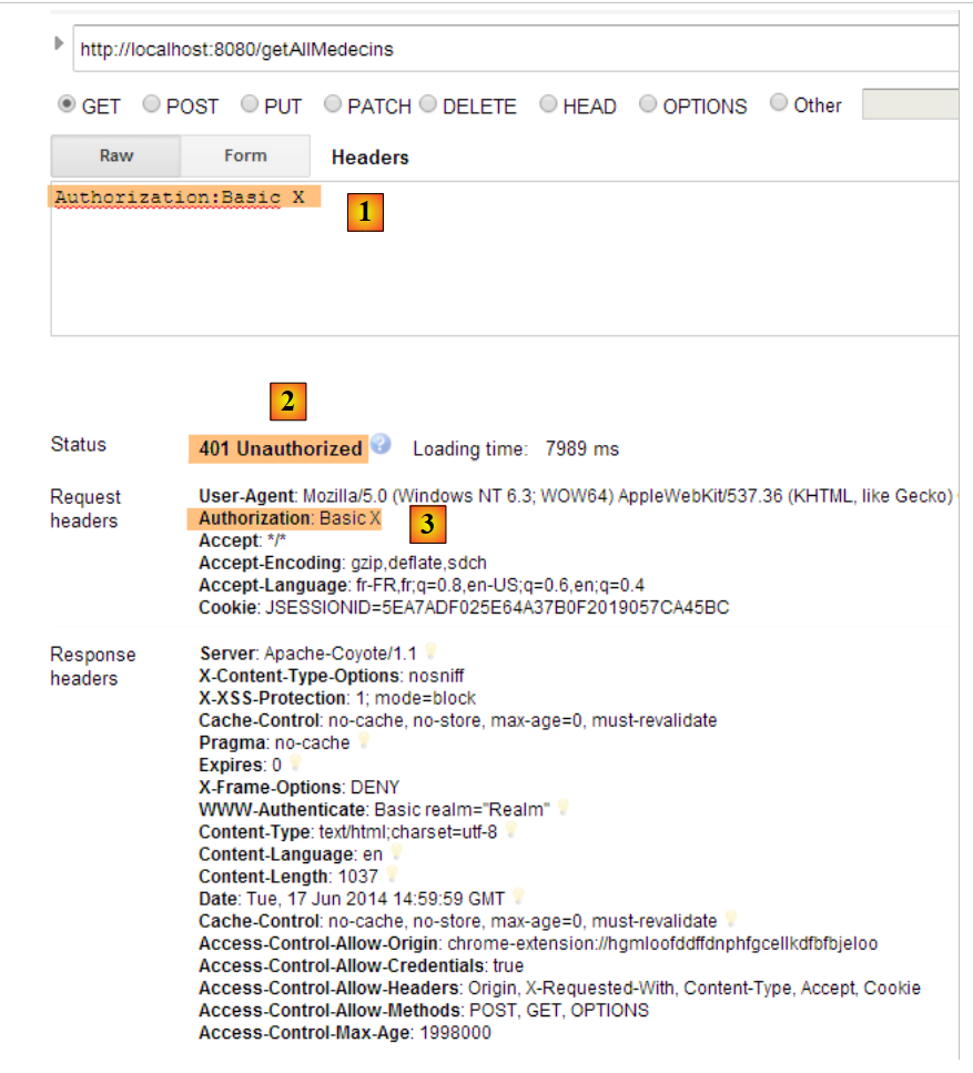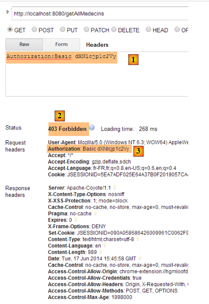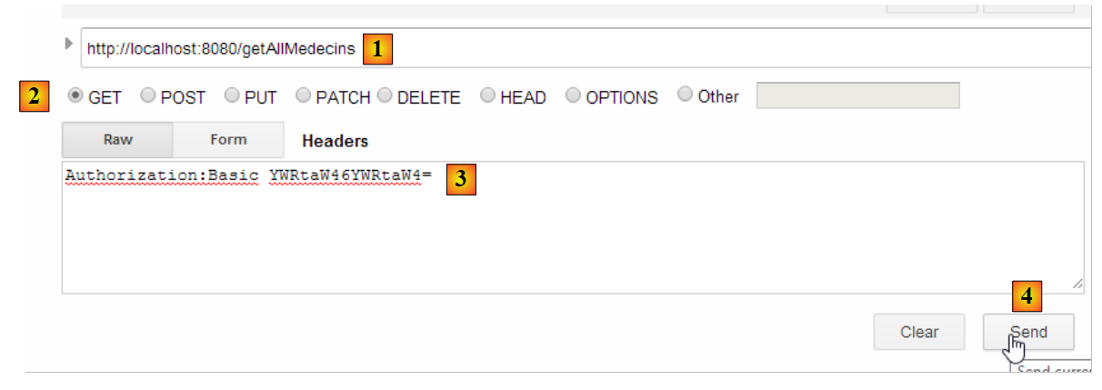 - en [2] et [3], l'identifiant et le mot de passe de celui qui veut utiliser l'application. Il y a deux utilisateurs : admin/admin (login/password) avec un rôle (ADMIN) et user/user avec un rôle (USER). Seul le rôle ADMIN a le droit d'utiliser l'application. Le rôle USER n'est là que pour montrer ce que répond le serveur dans ce cas d'utilisation ;