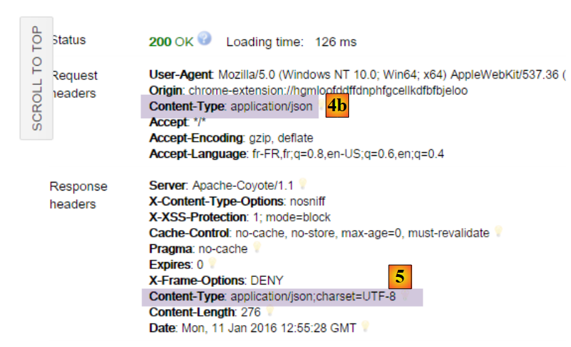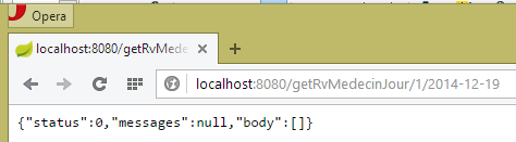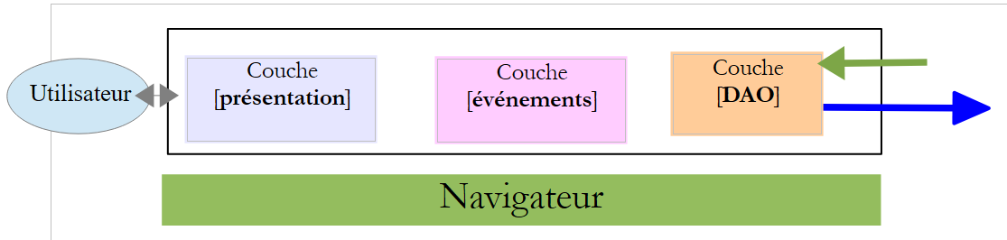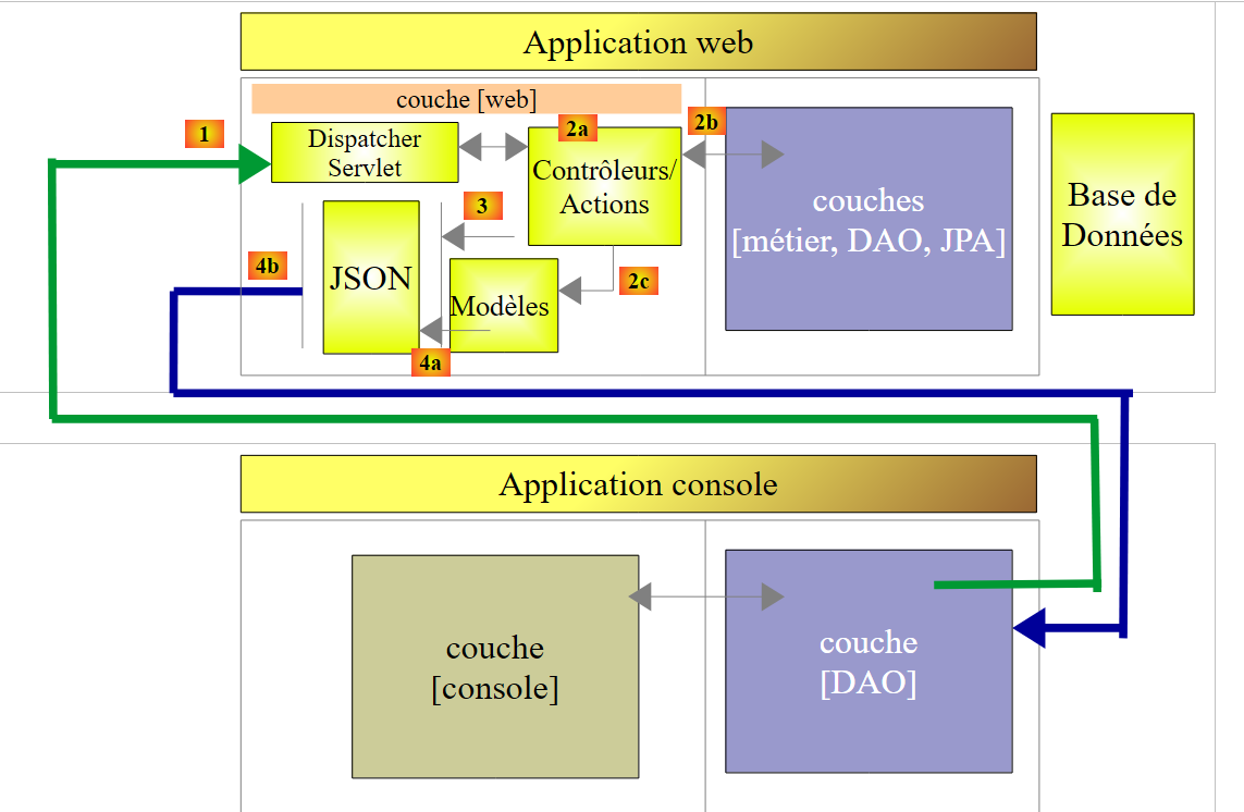 - l'utilisateur va interagir avec les vues qui lui sont présentées dans le navigateur. Ses actions vont parfois nécessiter l'interrogation du serveur Spring 4 [2]. Celui-ci traitera la demande et rendra une réponse jSON (JavaScript Object Notation) [3]. Celle-ci sera utilisée pour mettre à jour la vue présentée à l'utilisateur.