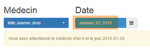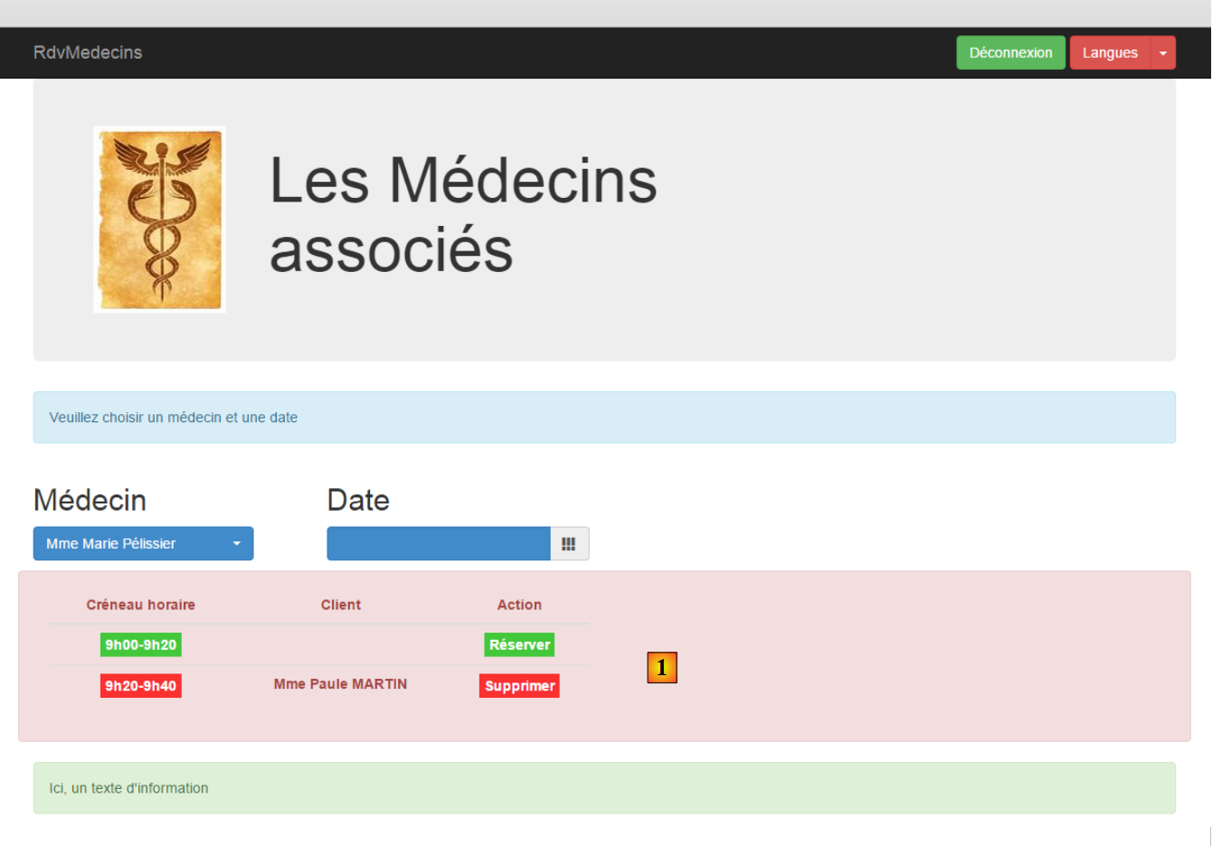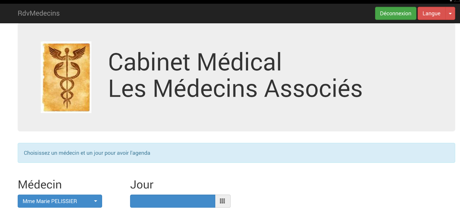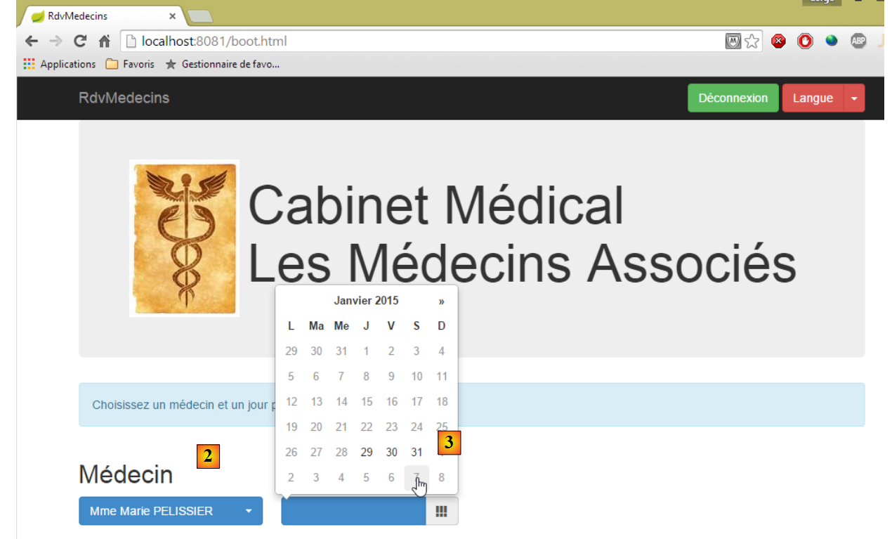 - une fois connecté, on peut choisir le médecin avec lequel on veut un rendez-vous [2] et le jour de celui-ci [3]. Dès qu'un médecin et un jour ont été renseignés, l'agenda est automatiquement affiché :