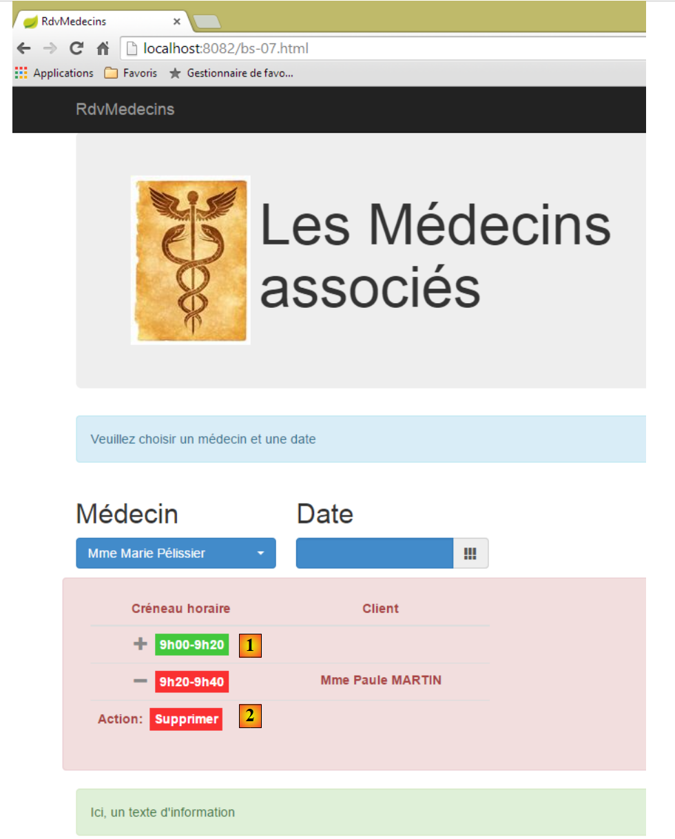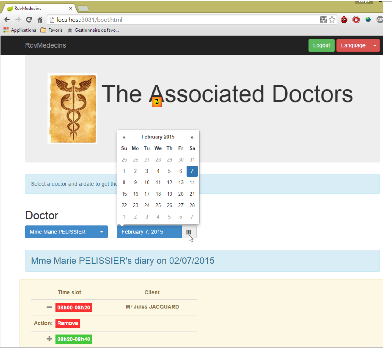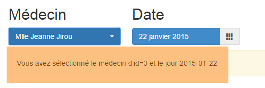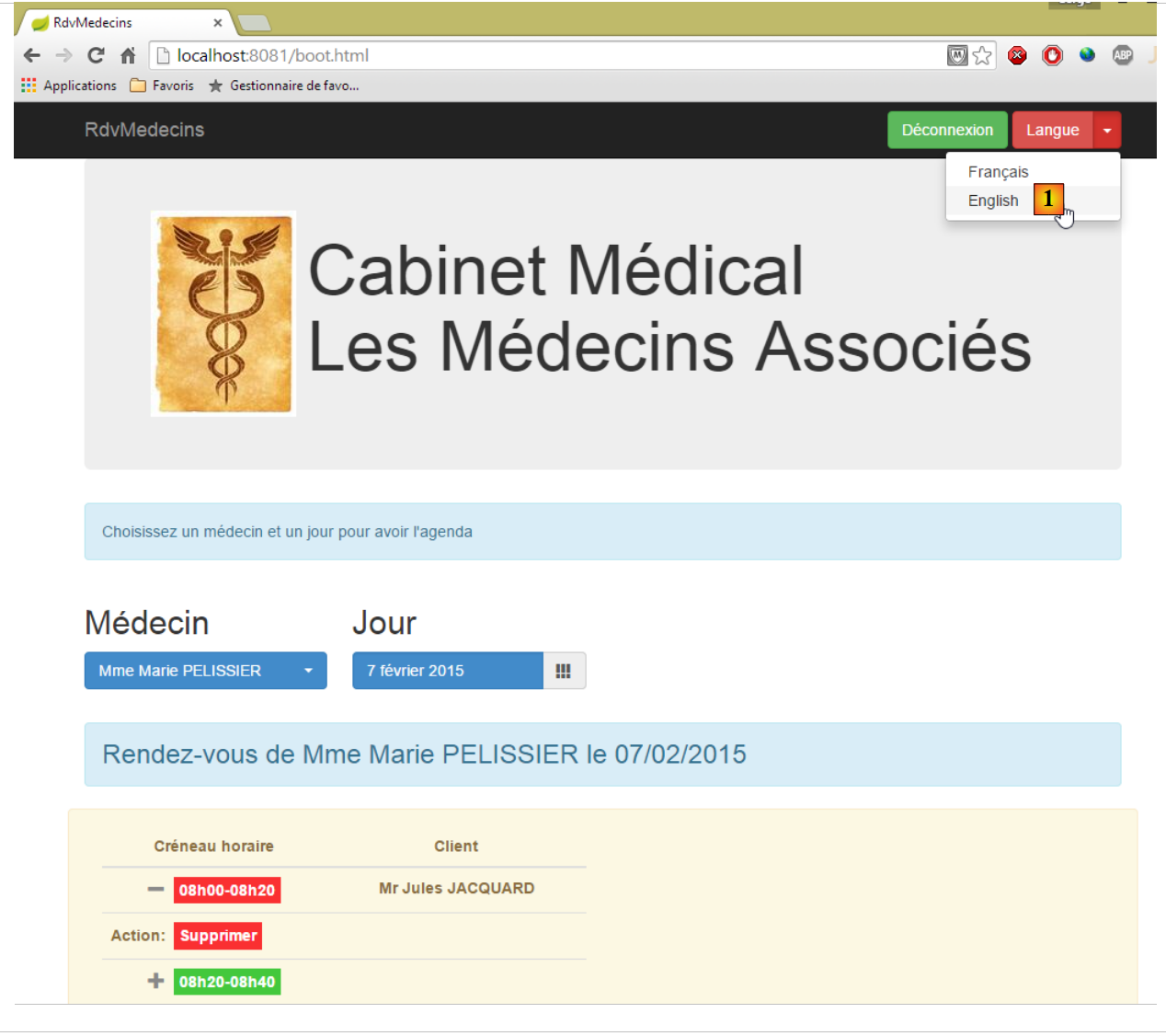 - une fois connecté, on peut choisir le médecin avec lequel on veut un rendez-vous [2] et le jour de celui-ci [3]. Dès qu'un médecin et un jour ont été renseignés, l'agenda est automatiquement affiché :