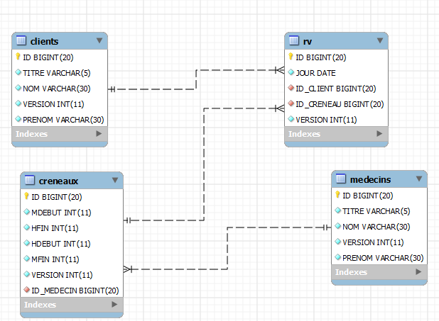 Les tables [roles], [users] et [users_roles] sont des tables liées à l'authentification. Dans un premier temps, nous n'allons pas nous en occuper. Les relations entre les tables gérant les rendez-vous sont les suivantes :