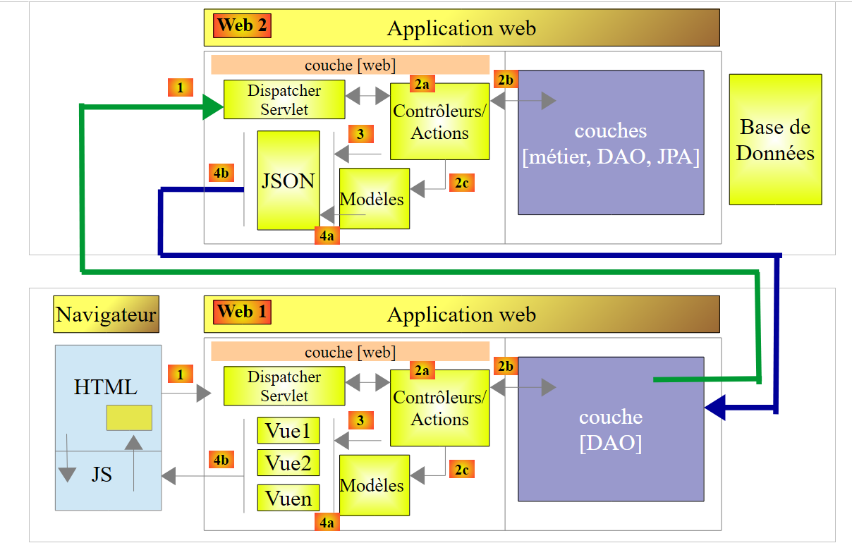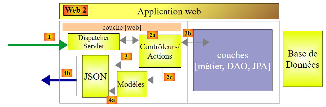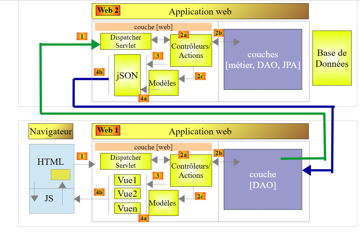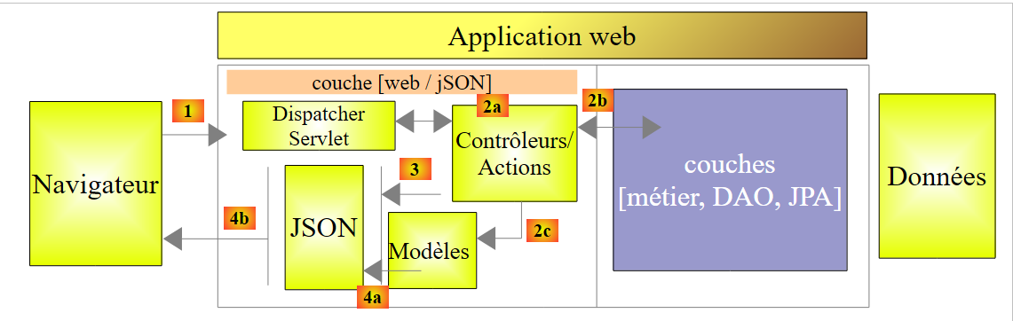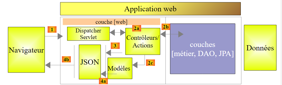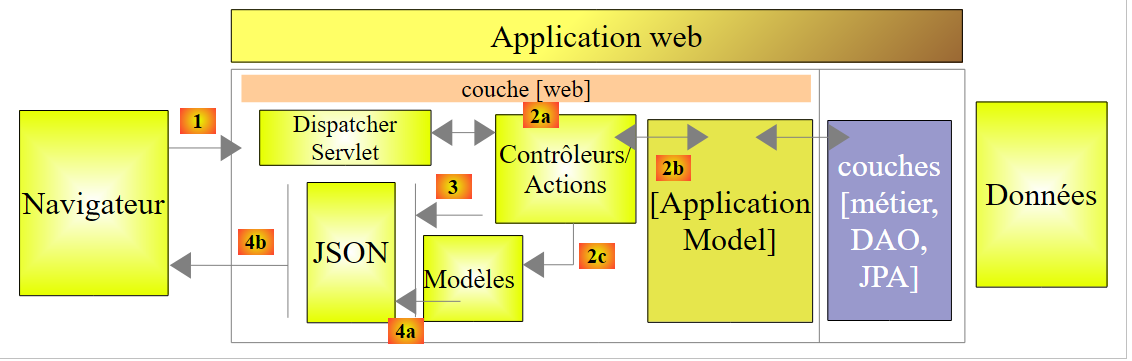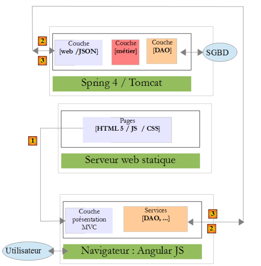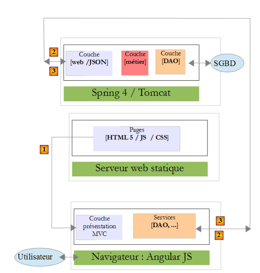 - en [1], un serveur web délivre des pages statiques à un navigateur. Ces pages contiennent une application AngularJS construite sur le modèle MVC (Modèle – Vue – Contrôleur). Le modèle ici est à la fois celui des vues et celui du domaine représenté ici par la couche [Services] ;