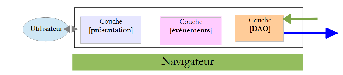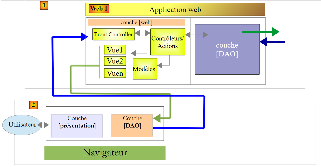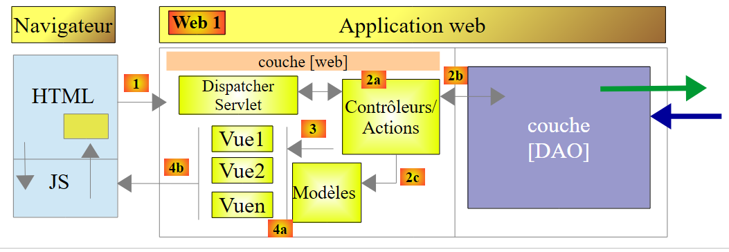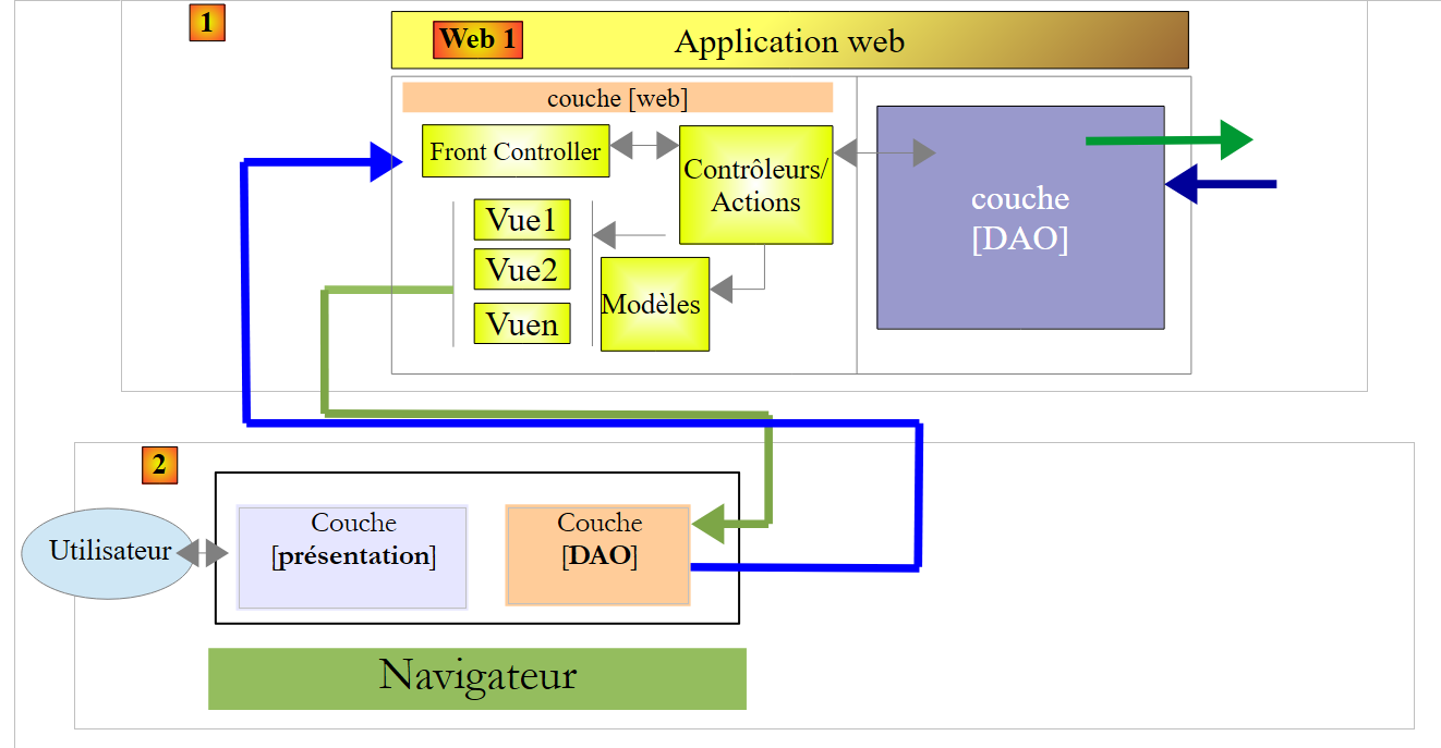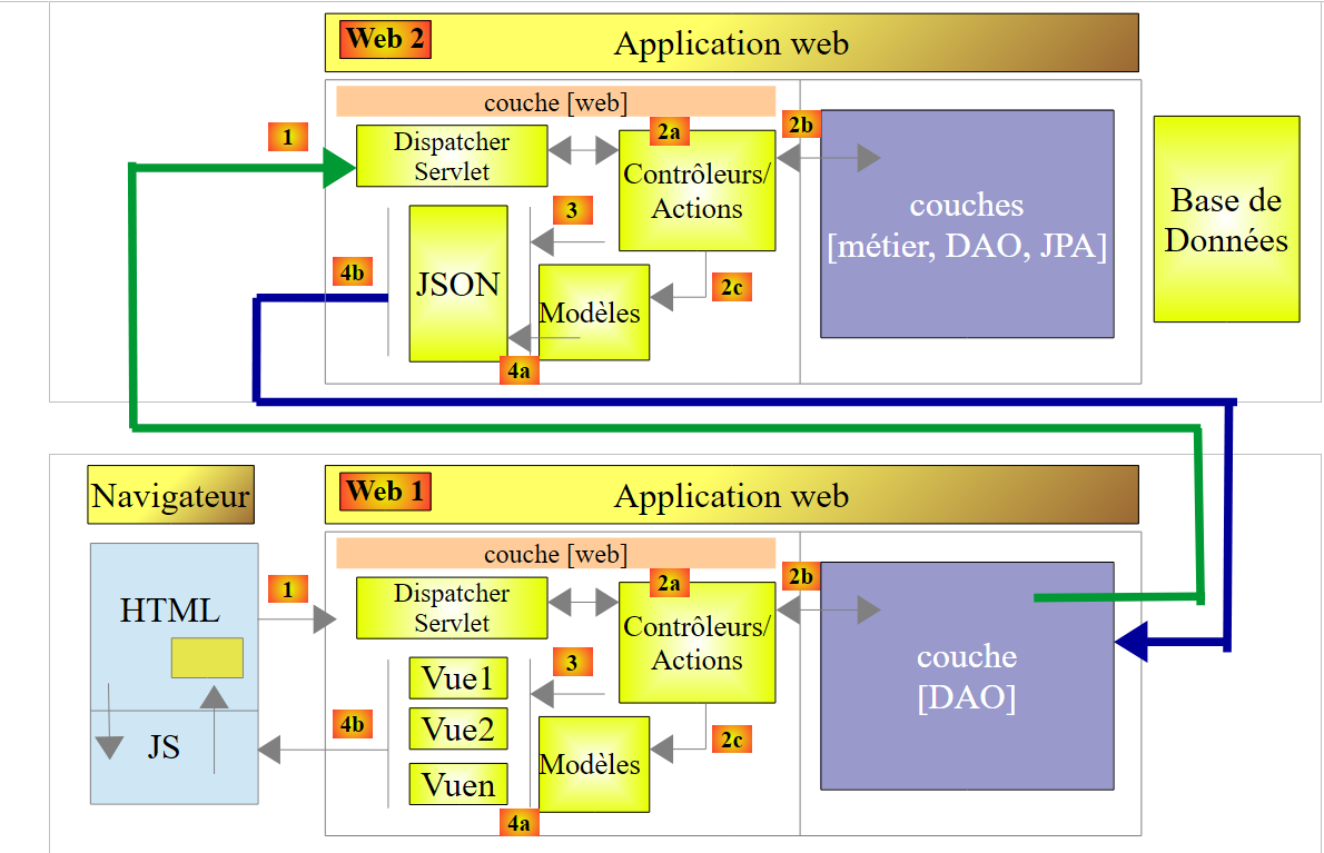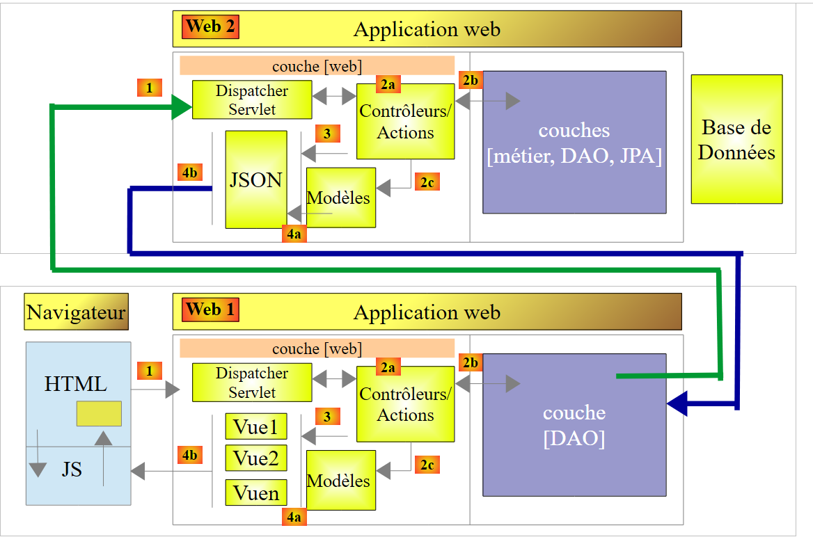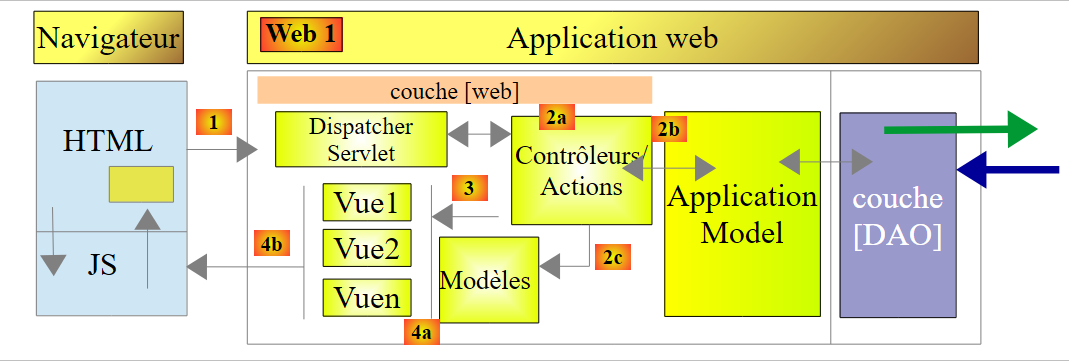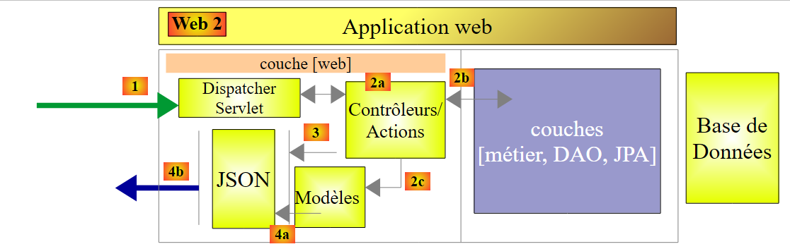 - en [1], un serveur web délivre des pages statiques à un navigateur. Ces pages contiennent une application AngularJS construite sur le modèle MVC (Modèle – Vue – Contrôleur). Le modèle ici est à la fois celui des vues et celui du domaine représenté ici par la couche [Services] ;