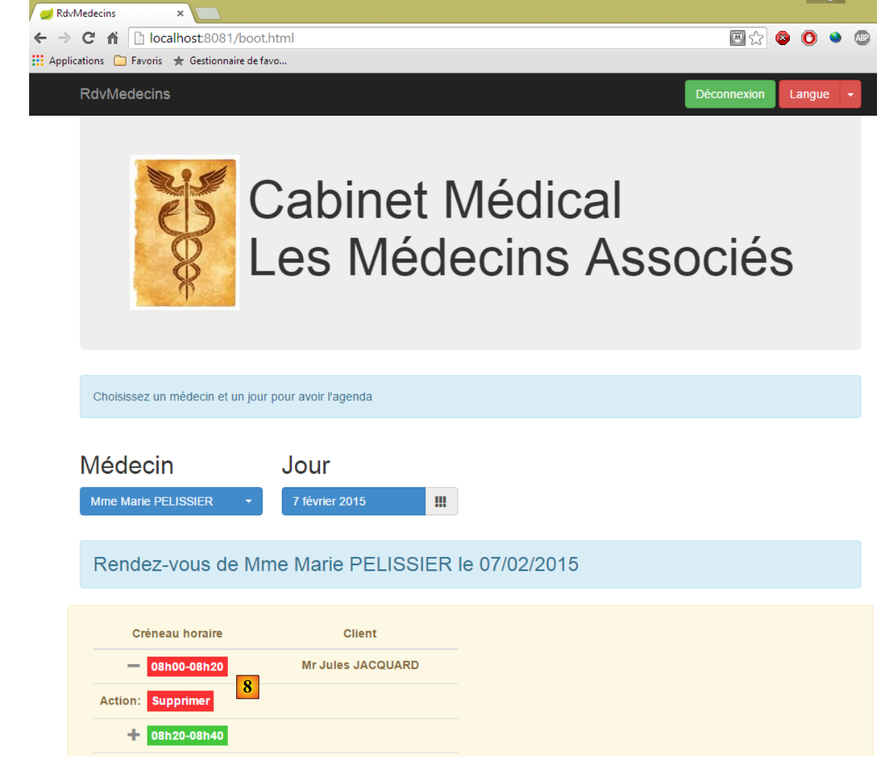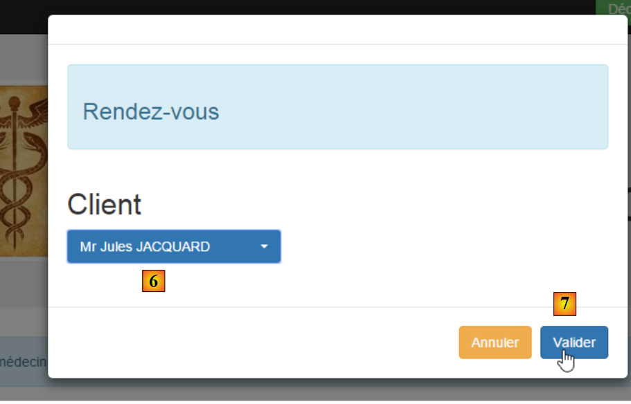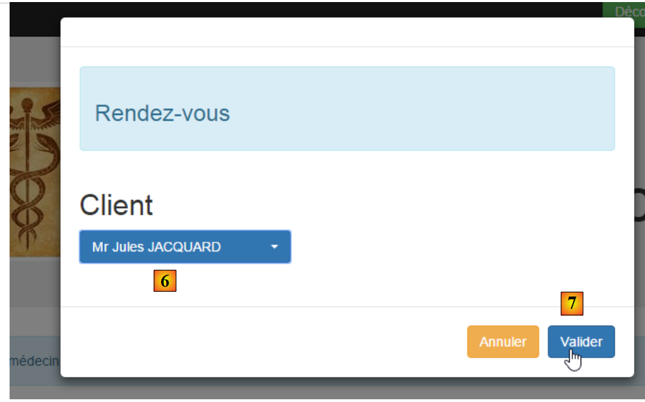 - en [6], on choisit le patient pour le rendez-vous et on valide ce choix en [7] ;