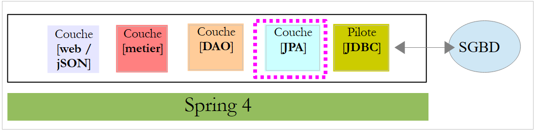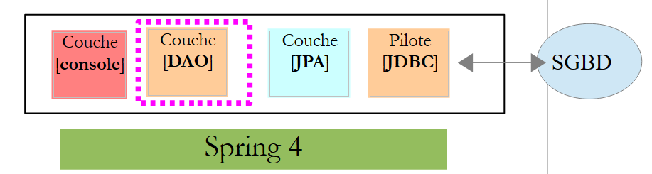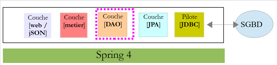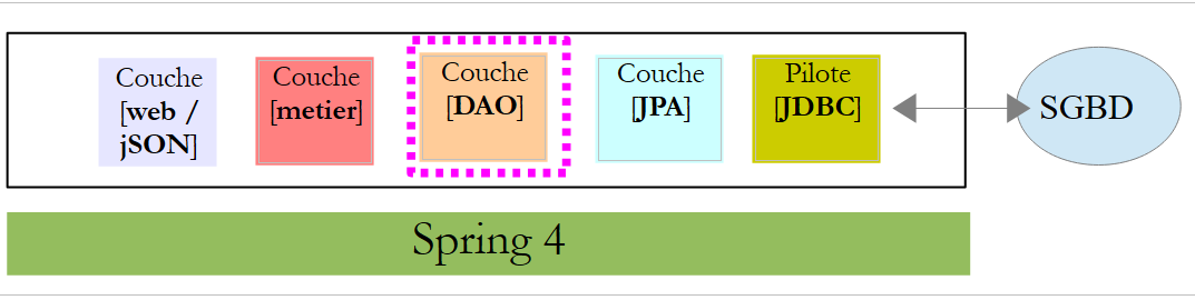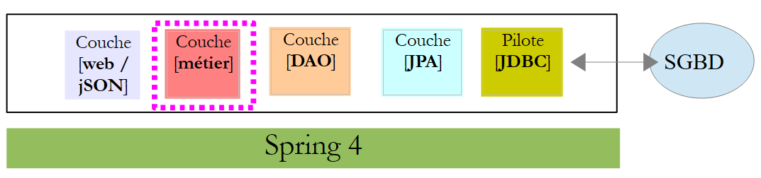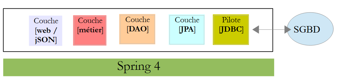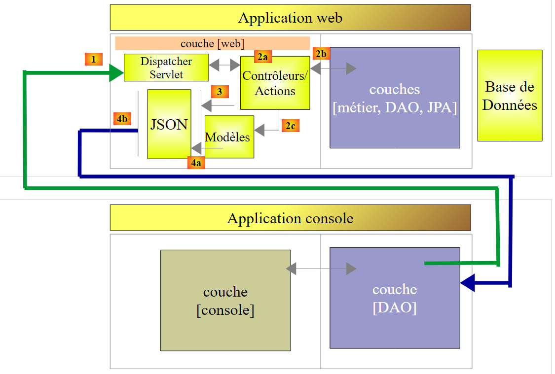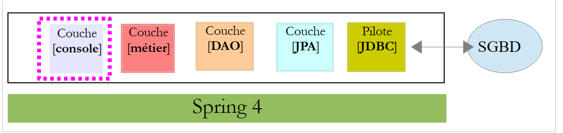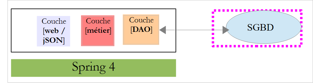 Nous nous proposons de reprendre cette application et de l'implémenter de bout en bout avec Spring MVC. L'architecture devient alors la suivante :