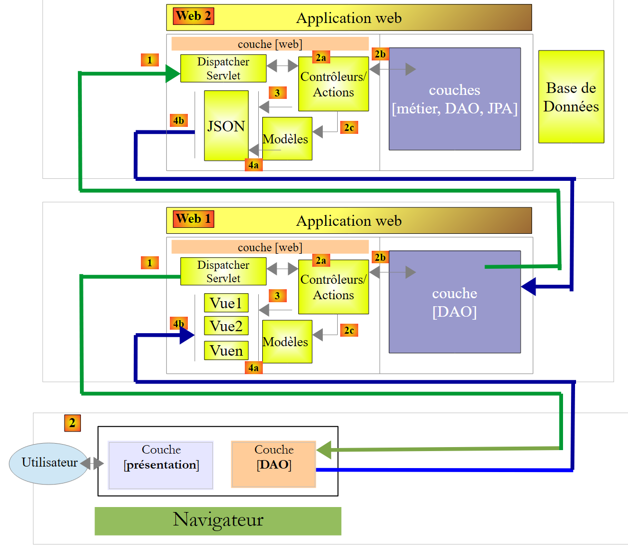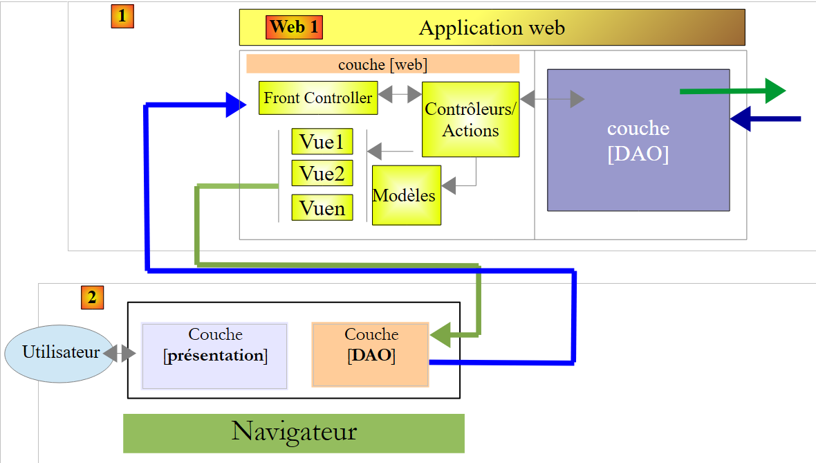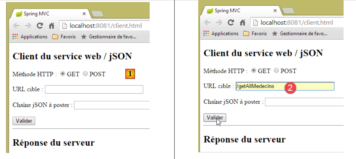 Le navigateur se connectera à une application [Web 1] implémentée par Spring MVC qui ira chercher ses données auprès d'un service web [Web 2] lui aussi implémenté avec Spring MVC.
