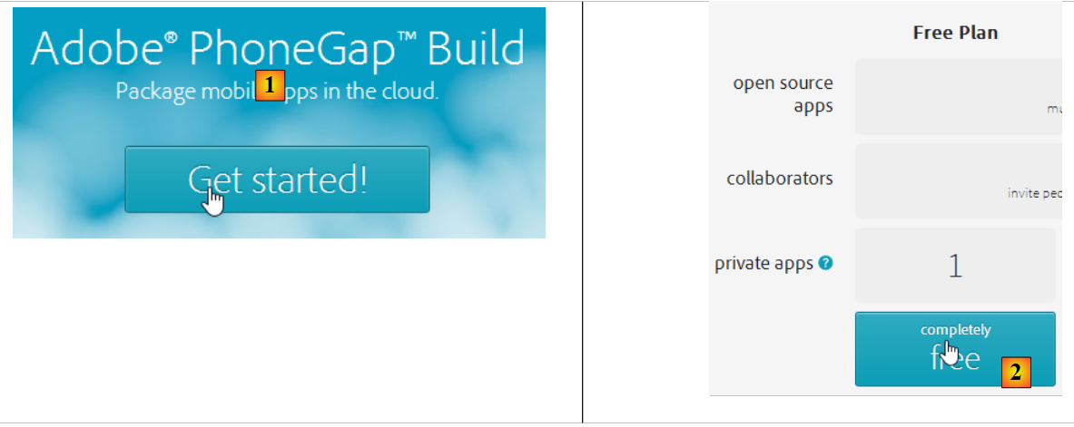 - en [2], on choisit un plan gratuit n'autorisant qu'une application Phonegap ;