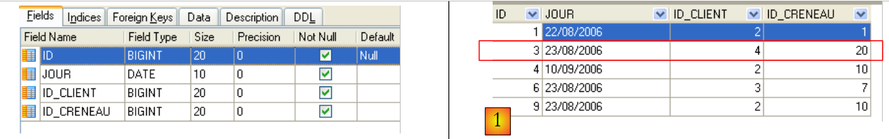 Cette table a une contrainte d'unicité sur les valeurs des colonnes jointes (JOUR, ID_CRENEAU) :