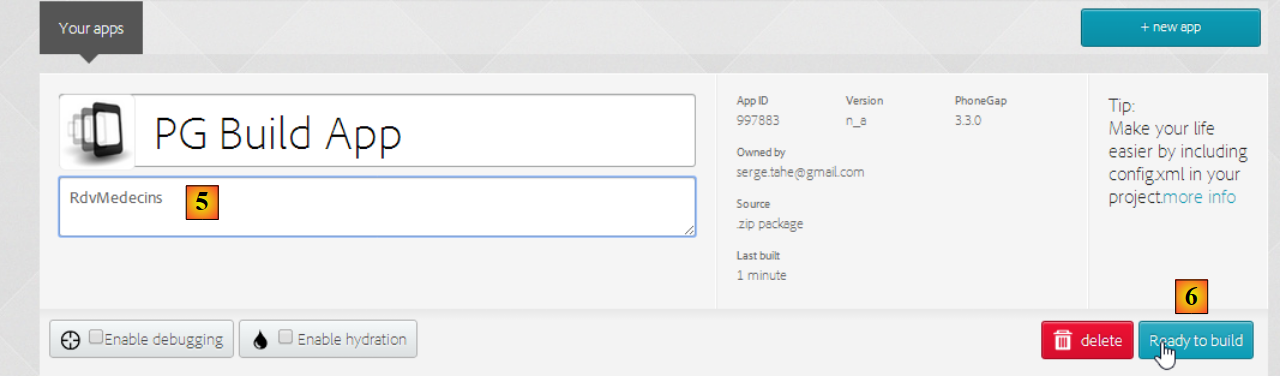 - en [6], on la construit. Cette opération peut prendre 1 minute. Patientez jusqu'à ce que les icônes des différentes plate-formes mobiles indiquent que la construction est terminée ;