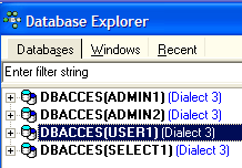 Ouvrons maintenant une connexion sur la base [DBACCES] (Database / Register database) sous le nom [SELECT1 / select1], l'un des utilisateurs créés précédemment puis double-cliquons sur le lien ainsi créé dans [Database Explorer] :