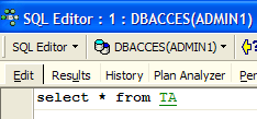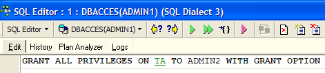 Donnons le droit à l'utilisateur [ADMIN2] le droit SELECT sur la table TA. Seul le propriétaire de la table peut donner ce droit, c.a.d. ici [ADMIN1]. Positionnons-nous sur la connexion DBACCES(ADMIN1) et ouvrons un nouvel éditeur SQL (Shift+F12) :