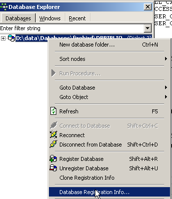 IB-Expert permet de fixer d'une autre façon le mode d'isolation. Cliquons droit sur la connexion DBACCES(ADMIN1) pour prendre l'option [Database Registration Info] :