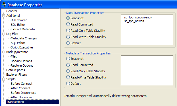 L'écran de droite montre la présence d'une option [Transactions]. Elle va nous permettre de fixer le niveau d'isolation des transactions. Nous le fixons ici à [snapshot]. Nous faisons de même avec la connexion DBACCES(ADMIN2).
