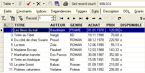 INSERT INTO BIBLIO2 (ID, TITRE, AUTEUR, GENRE, ACHAT, PRIX, DISPONIBLE) VALUES (2, 'Les fleurs du mal', 'Baudelaire', 'POèME', '1978-01-01', 120, 'n');