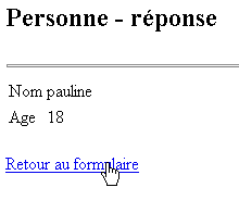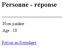 Si l'utilisateur envoie des données correctes, l'application lui envoie une réponse au moyen de la page JSP reponse.personne.jsp.