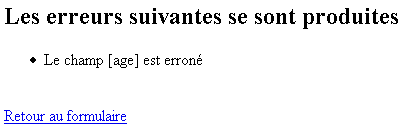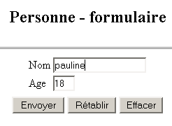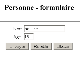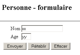 L'utilisateur remplit le formulaire et appuie sur le bouton [Envoyer] de type submit. Le bouton [Rétablir] est de type reset, c.a.d. qu'il remet le document dans l'état où il a été reçu. Le bouton [Effacer] est de type button. L'utilisateur doit fournir un nom et un âge valides. Si ce n'est pas le cas, une page d'erreurs lui est envoyée au moyen de la page JSP erreurs.personne.jsp. Voici des exemples :