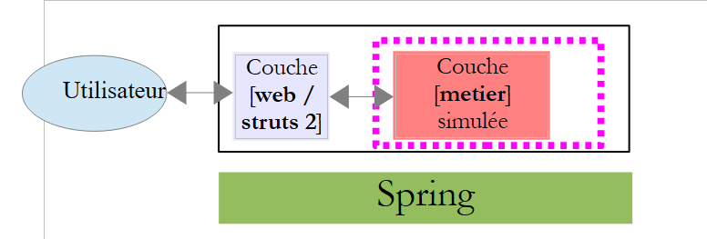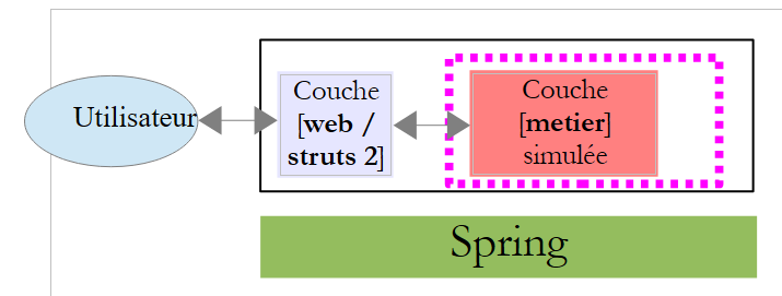 Nous allons développer la couche [web] avec la couche [métier] simulée. Les tests seront plus simples à faire car il n'y a plus de base de données dans l'architecture. Grâce à Spring et à l'utilisation d'interfaces, remplacer ultérieurement la couche [metier] simulée par la véritable architecture [metier, dao, jpa] aura un impact nul sur le code de la couche [web / struts2]. La couche [web / struts2] que nous allons développer maintenant pourra être utilisée telle quelle.