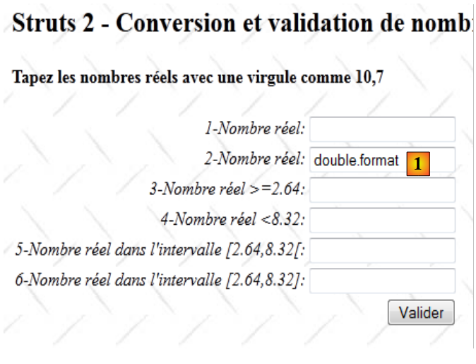 Maintenant, retour à la complexité des champs de saisie du formulaire [FormDouble.JSP]. On va raisonner sur le champ double2. Le raisonnement s'étend aux champs double3 à double5 qui ont un modèle de type Double. Pour les champs double1 et double6 qui ont un modèle de type String, il n'y a pas de problème.