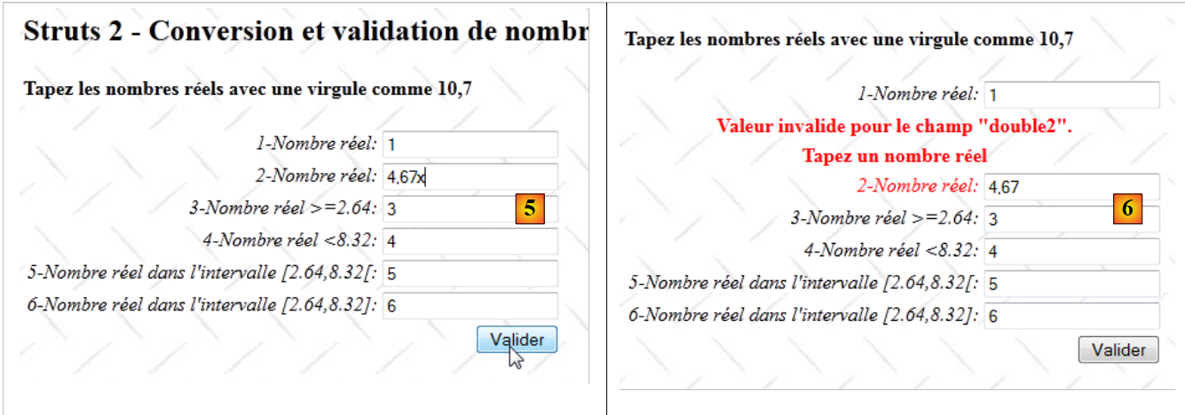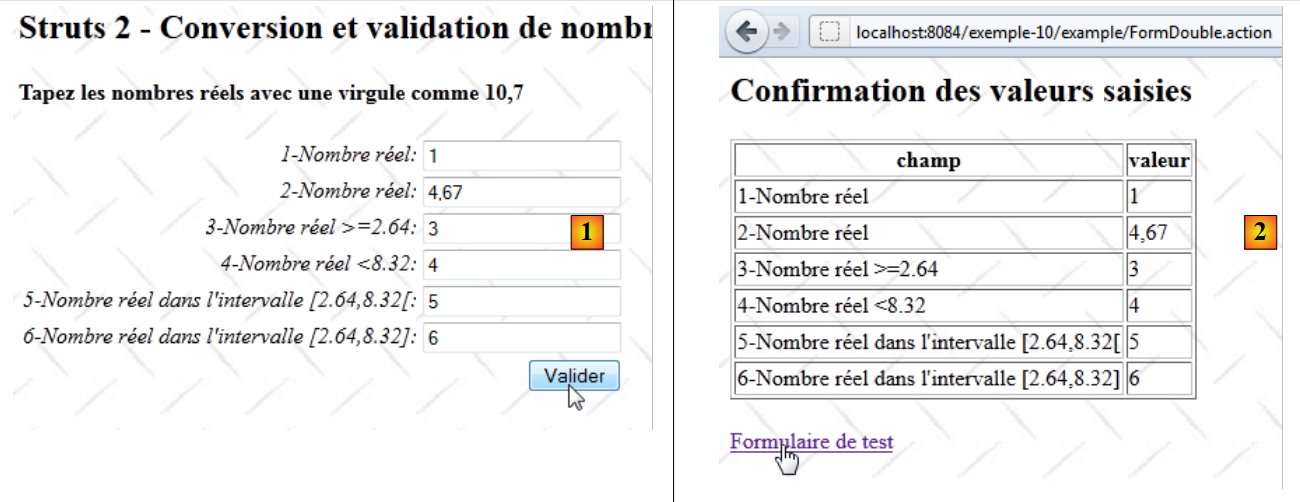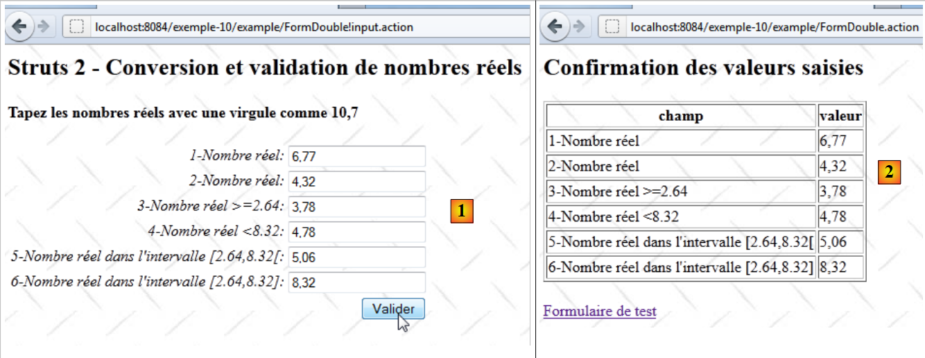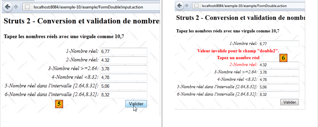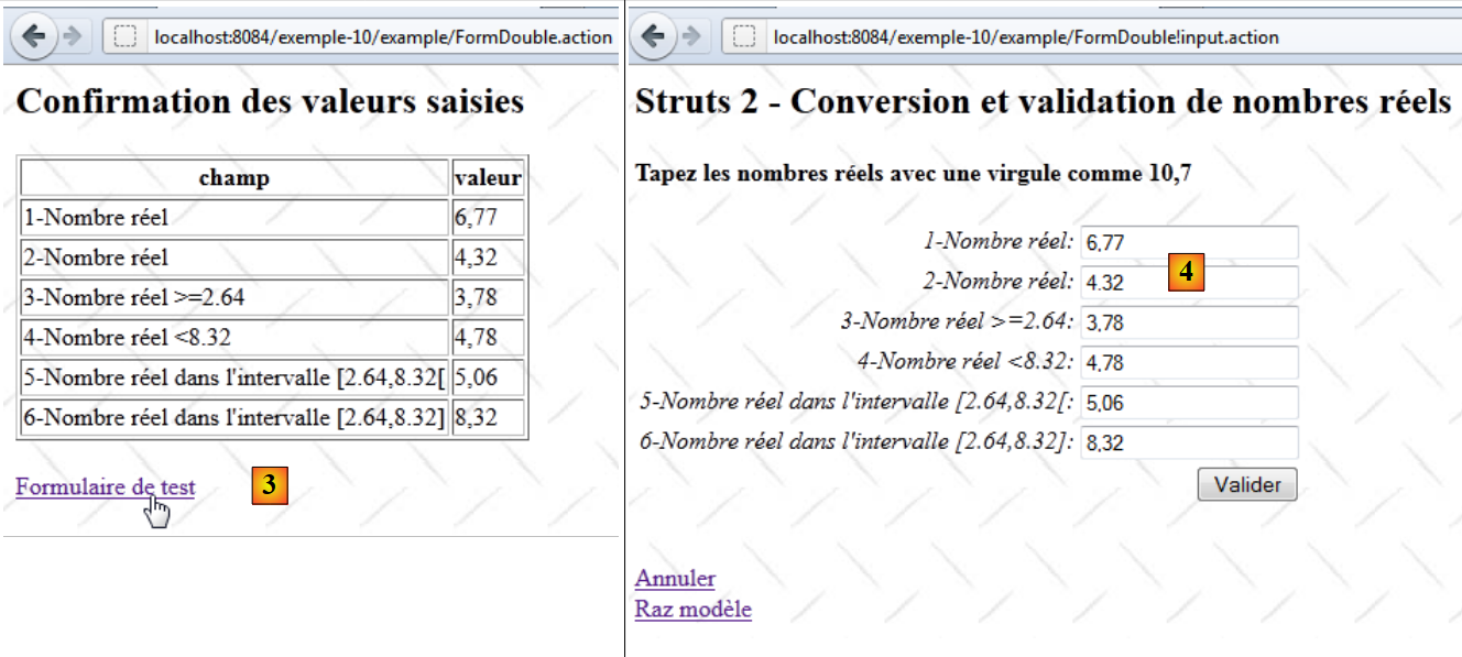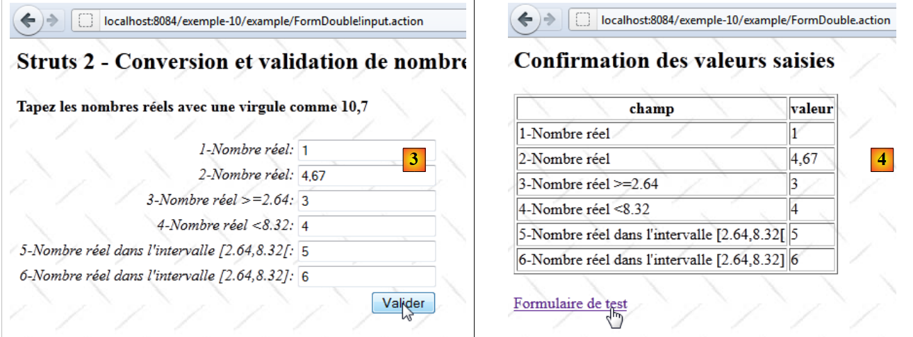 - le nouveau formulaire [4] affiche dans le champ double2 la valeur du réel 4.32. Comme on n'a pas localisé l'affichage, il l'affiche par défaut à l'anglo-saxonne, c.a.d. avec un point décimal. Donc dans le sens Double --> String, Struts ne tient plus compte de la locale sinon il aurait affiché 4,32 avec une virgule.