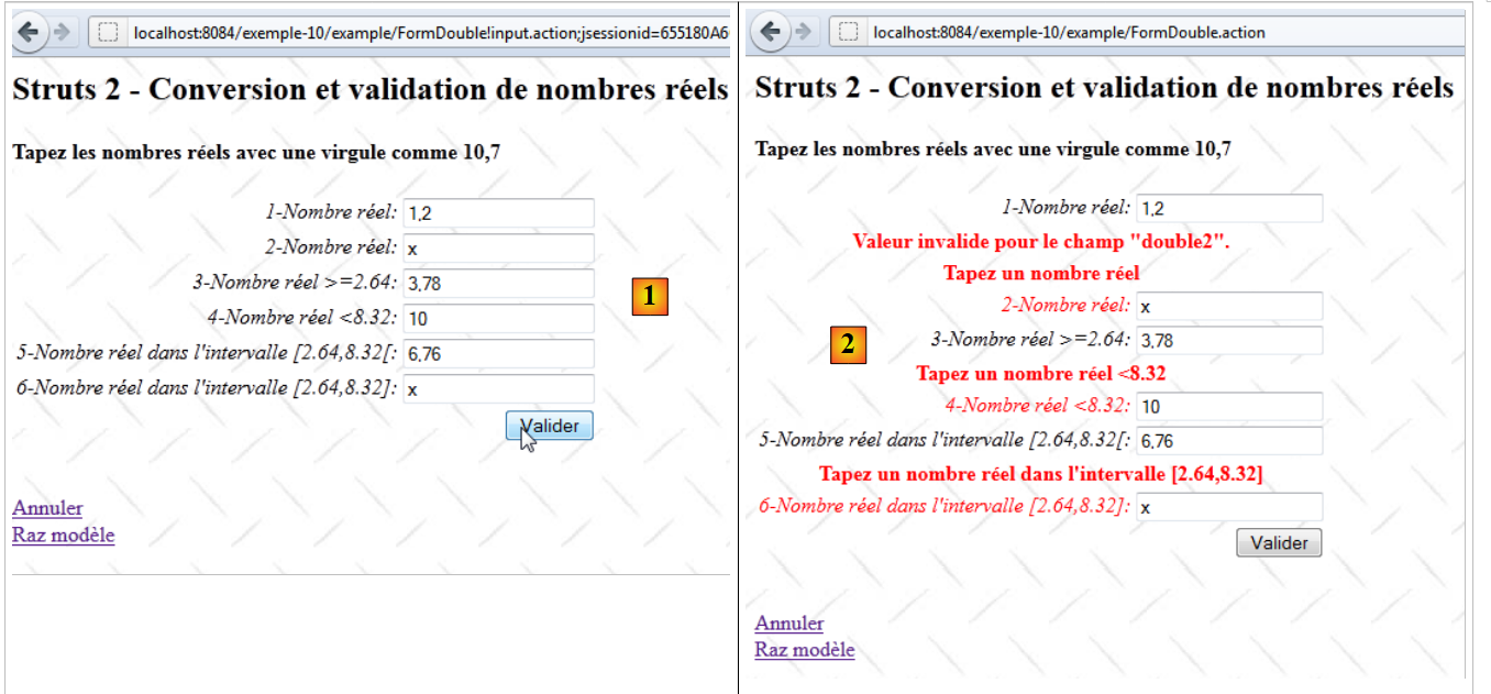 Une fois le fichier [FormDoubleModel-validation.xml] exploité par l'intercepteur de validation, celui-ci fait exécuter la méthode validate de l'action [FormDouble] si elle existe. Nous allons la présenter en même temps que la totalité de l'action.