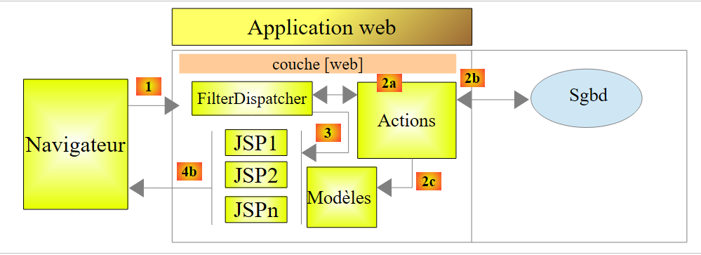 demande - le client navigateur fait une demande au contrôleur [FilterDispatcher]. Celui-ci voit passer toutes les demandes des clients. C'est la porte d'entrée de l'application. C'est le C de MVC.