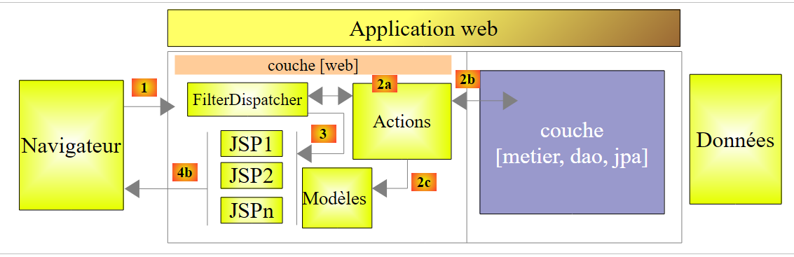 - la couche [web] est la couche en contact avec l'utilisateur de l'application web. Celui-ci interagit avec l'application web au travers de pages web visualisées par un navigateur. C'est dans cette couche que se situe Struts 2 et uniquement dans cette couche.
