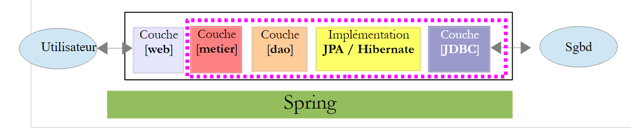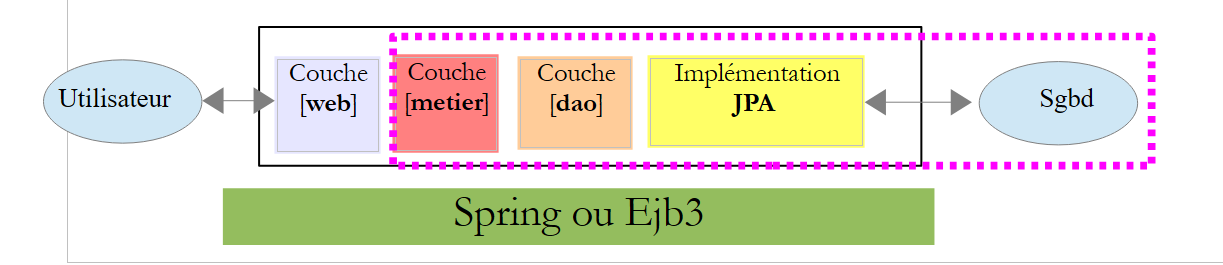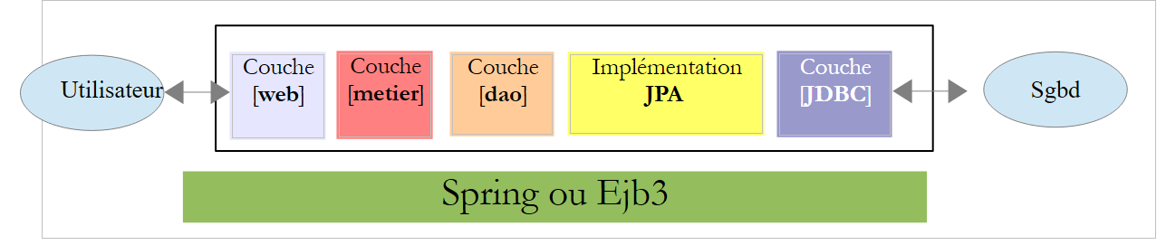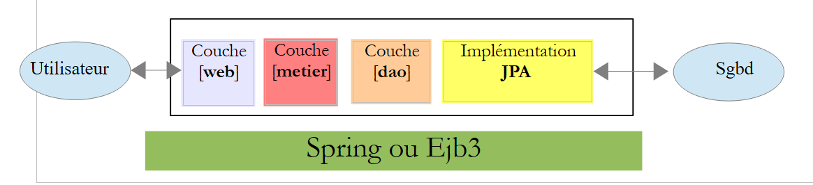 - l'intégration des couches peut être réalisée par un conteneur Spring ou Ejb3 (Enterprise Java Bean).