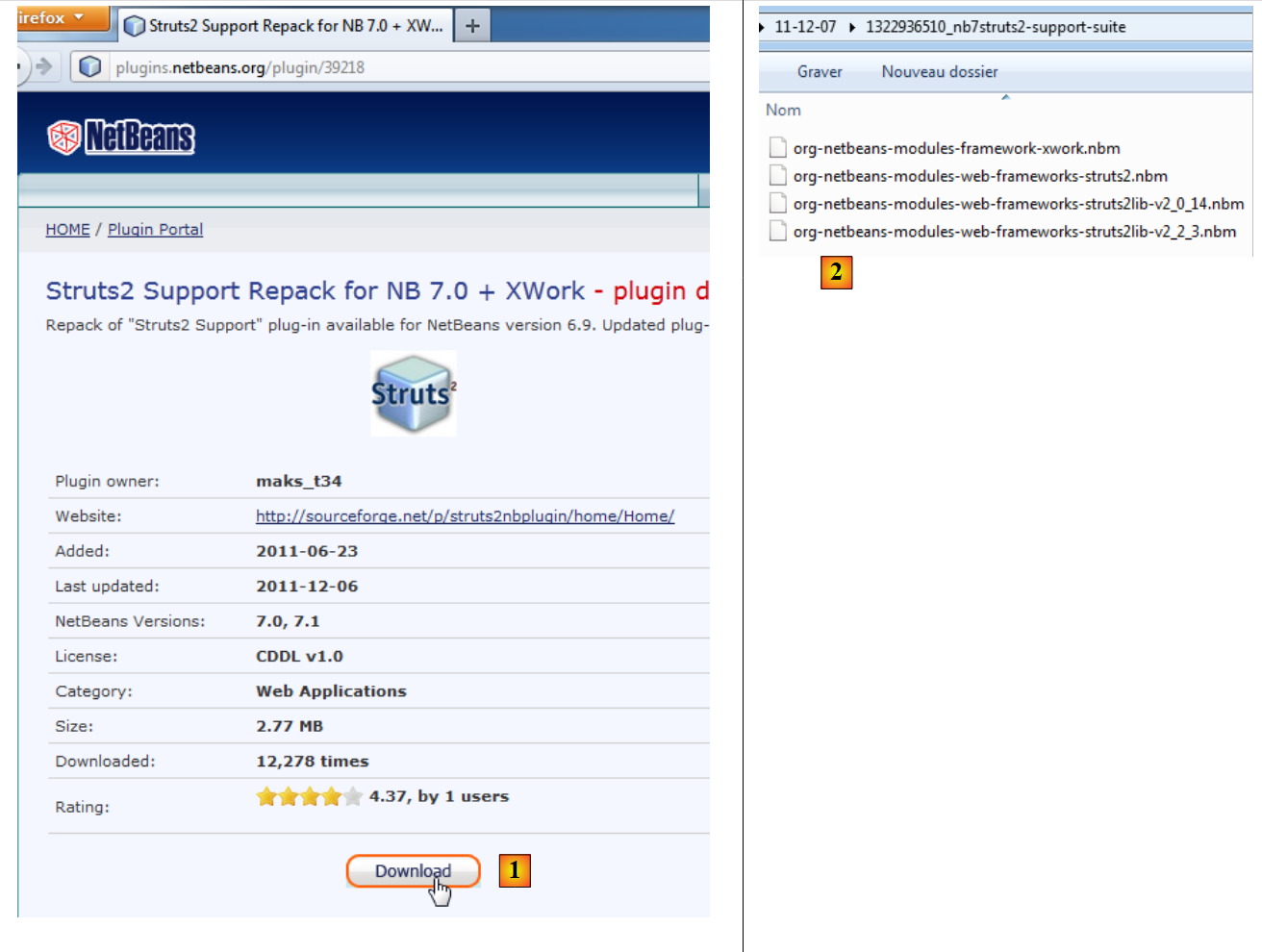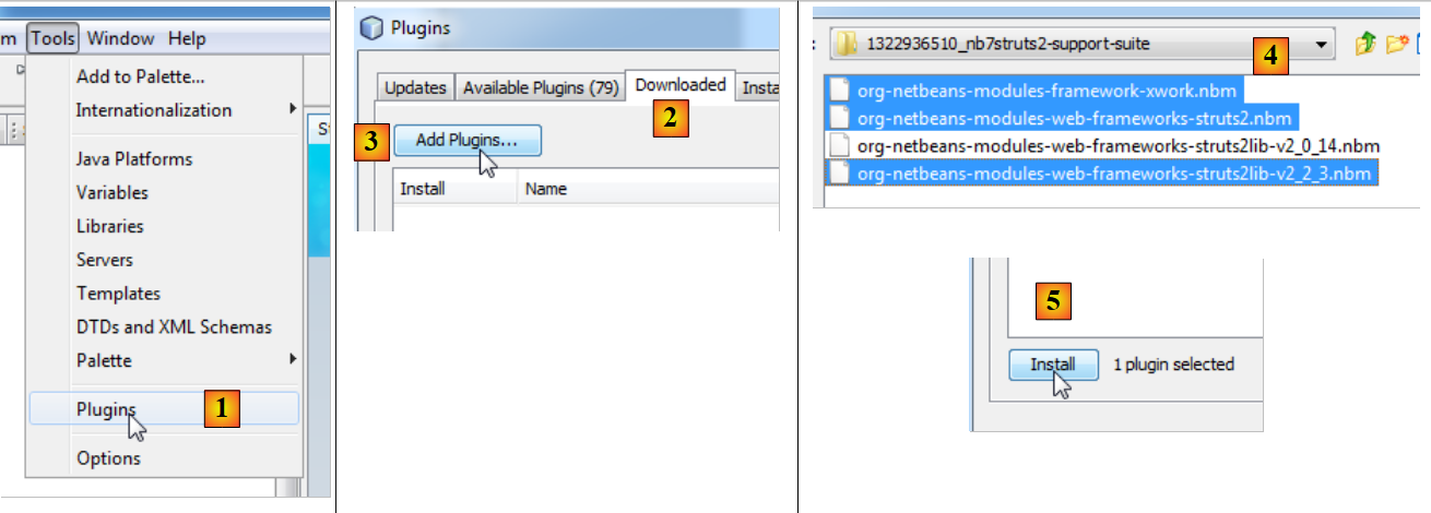 - en [4], choisir les fichiers .nbm des plugins téléchargés. Ici, nous choisissons les bibliothèques de Struts version 2.2.3 plutôt que celles de Struts 2.0.14