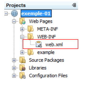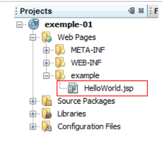 - lignes 16-18 : définissent le fichier à afficher lorsque l'utilisateur interroge l'application web sans demander de document. Ainsi lorsque l'URL demandée sera [http://machine:port/exemple-01], l'URL servie sera [http://machine:port/exemple-01/example/HelloWord.JSP].