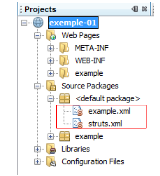 Tout dossier ou bibliothèque situé dans ces deux branches fait donc partie du ClassPath du projet. Il est usuel de mettre [struts.xml] dans <default package>. Ici, son contenu est le suivant :