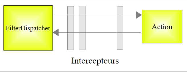 Pour traiter une URL de la forme [http://machine:port/.../Action], le contrôleur [FilterDispatcher] va instancier la classe qui implémente l'action demandée et va exécuter l'une de ses méthodes, par défaut une méthode appelée execute. L'appel à cette méthode execute va traverser une série d'intercepteurs :