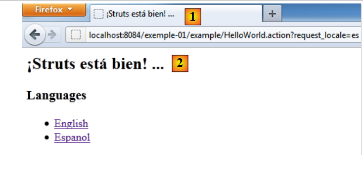 Si la langue utilisée par le navigateur client est l'espagnol (attribut es, dans package_es.properties), getText("HelloWorld.message") aura pour valeur ¡Struts está bien! ... Dans tous les autres cas, c'est le fichier [package.properties] qui sera utilisé.