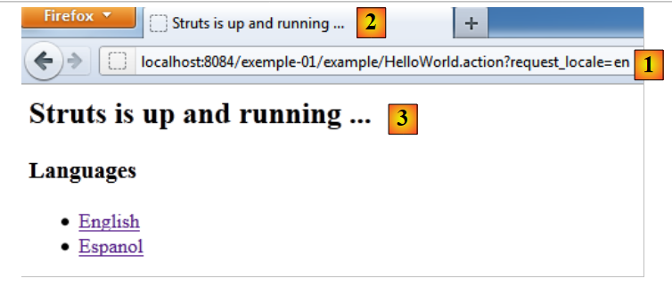 - en [2] et [3], on voit l'internationalisation à l'oeuvre. Les balises <title><s:text name="HelloWorld.message"/></title> et <h2><s:property value="message"/></h2> ont cette fois-ci produit leur effet.