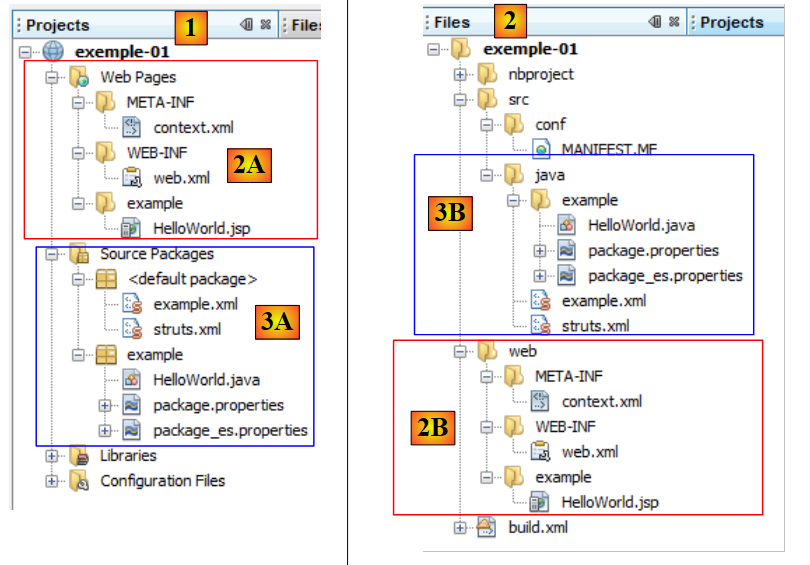 - en [3A], la branche [Source Packages] est représentée en [2] par le dossier [java] [3B]