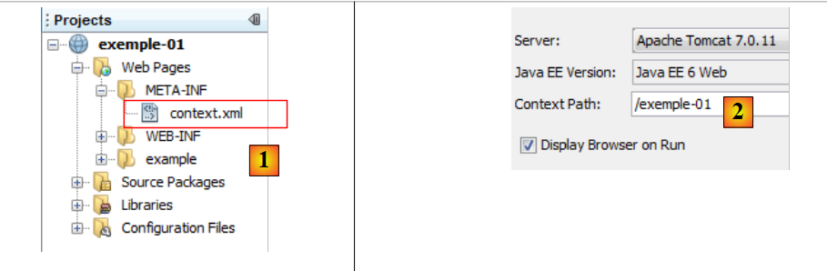 La ligne 2 indique que le contexte de l'application web est /exemple-01. Toutes les URL du type [http://machine:port/exemple-01/...] seront traitées par cette application. On peut retrouver ce contexte dans les propriétés du projet [2] : clic droit sur le projet / Properties / Run.