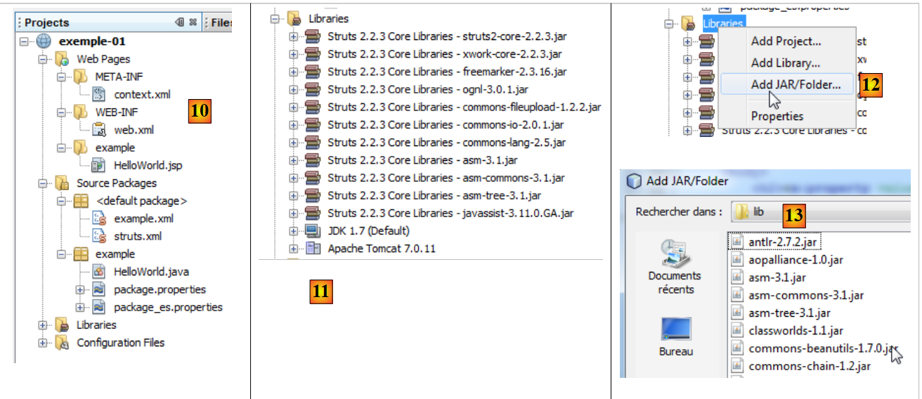 - en [11], les bibliothèques du projet. Elles ont été intégrées par le plugin Struts 2. Si on ne dispose pas du plugin, on pourra trouver ces bibliothèques dans le dossier [lib] de la distribution Struts 2 téléchargée. On suivra alors les étapes 12 et 13.