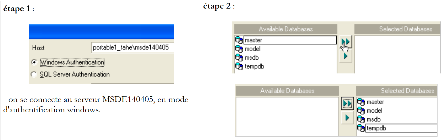 - étape 2 - l'authentification réussie, les bases par défaut de MSDE sont proposées. Ci-dessus, elles ont été toutes sélectionnées.