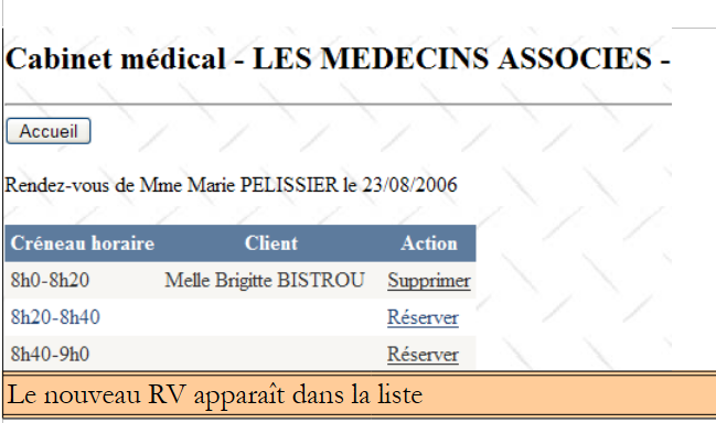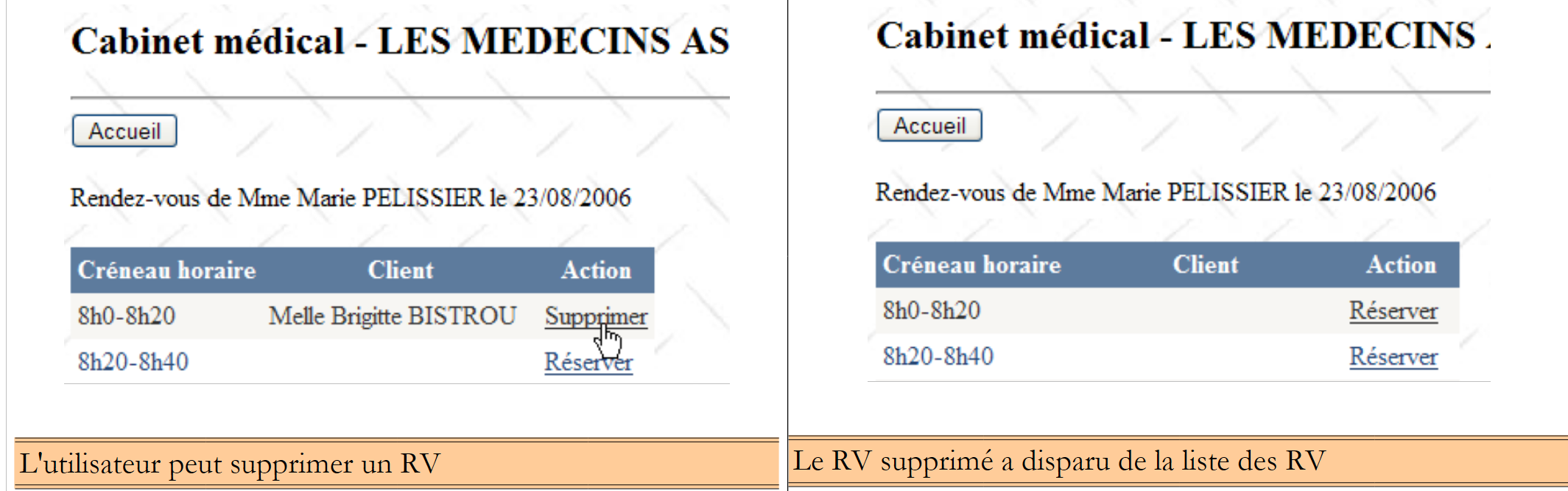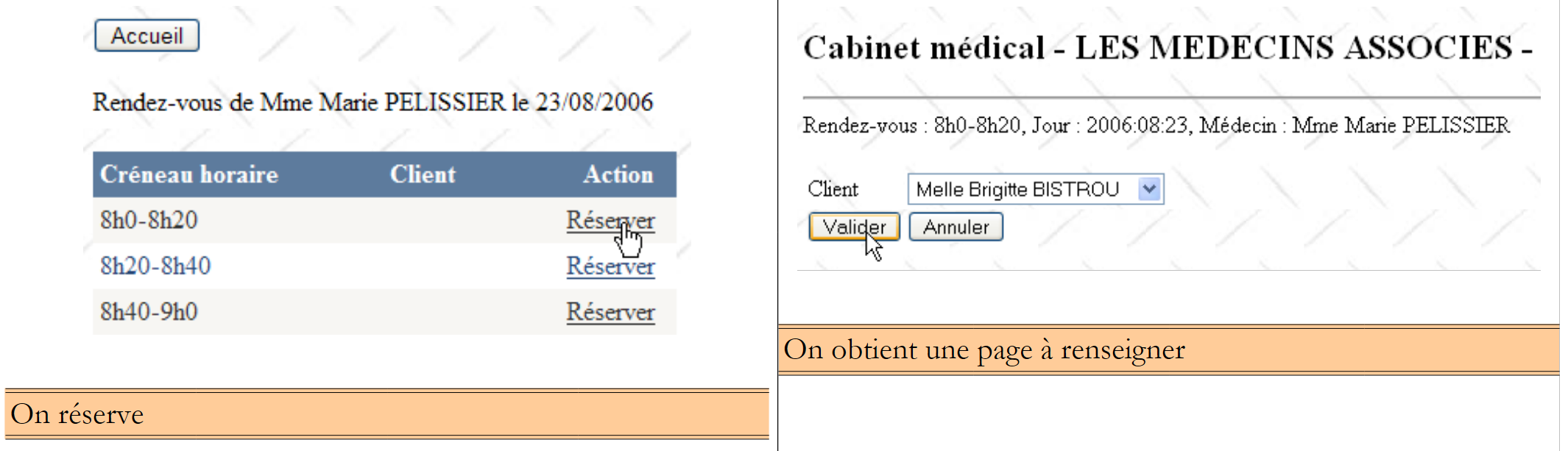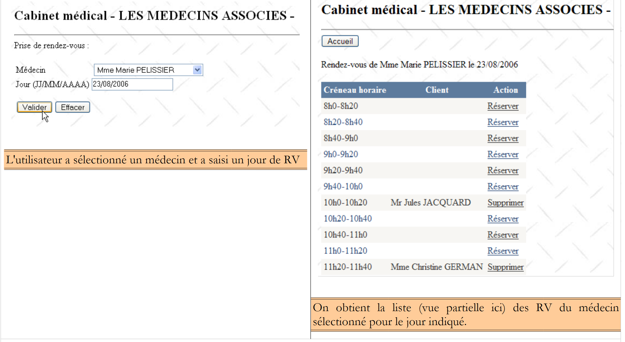 A partir de cette première page, l'utilisateur (Secrétariat, Médecin) va engager un certain nombre d'actions. Nous les présentons ci-dessous. La vue de gauche présente la vue à partir de laquelle l'utilisateur fait une demande, la vue de droite la réponse envoyée par le serveur.