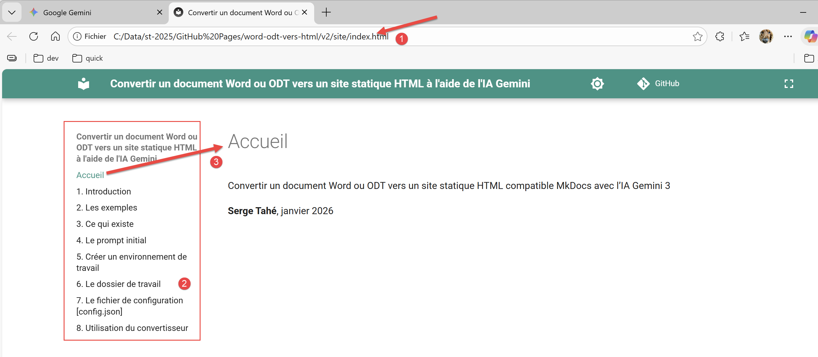 - En [3], la première page affichée est [Accueil]. Le contenu de cette page est le contenu du document ODT qui précède le premier chapitre de niveau Titre 1 ;
